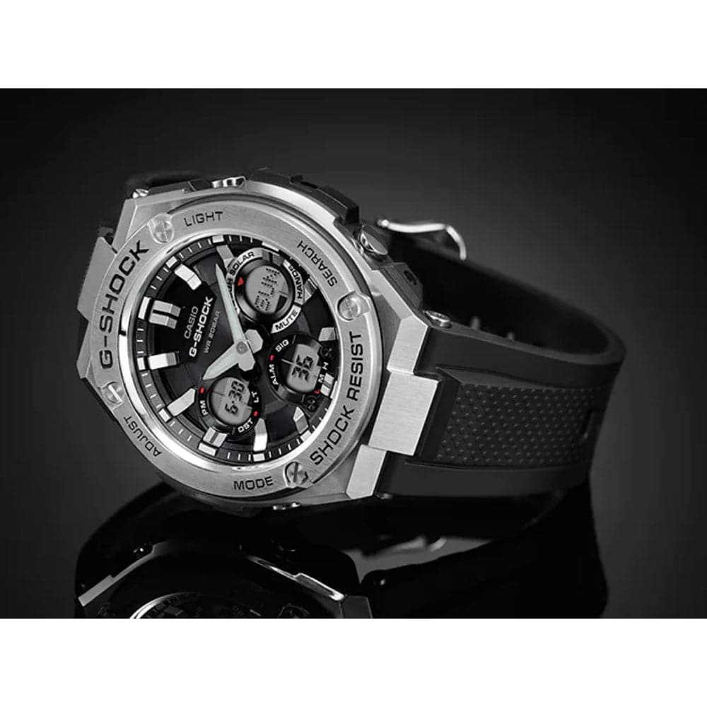 From G-SHOCK, the watch brand that is constantly setting new standards for timekeeping toughness, comes G-STEEL, a watch series with a new "layer guard structure". Different materials are used for the bezel to create a two-layer structure that adds a new dimension of shock resistant. For models that use stainless steel in the upper part, shock absorbing resin is employed in the lower part. If resin is used in the upper part, fine resin is used in the lower part to cushion against impact from the upper part. This also has made it possible create a wide range of different designs. The GST-S110 model expresses the hardness and beauty of metal. A hand shift feature temporarily moves hands out of the way with the press of a button for easy reading of digital display contents, while double LED face illumination keeps information easy to read at all times.
