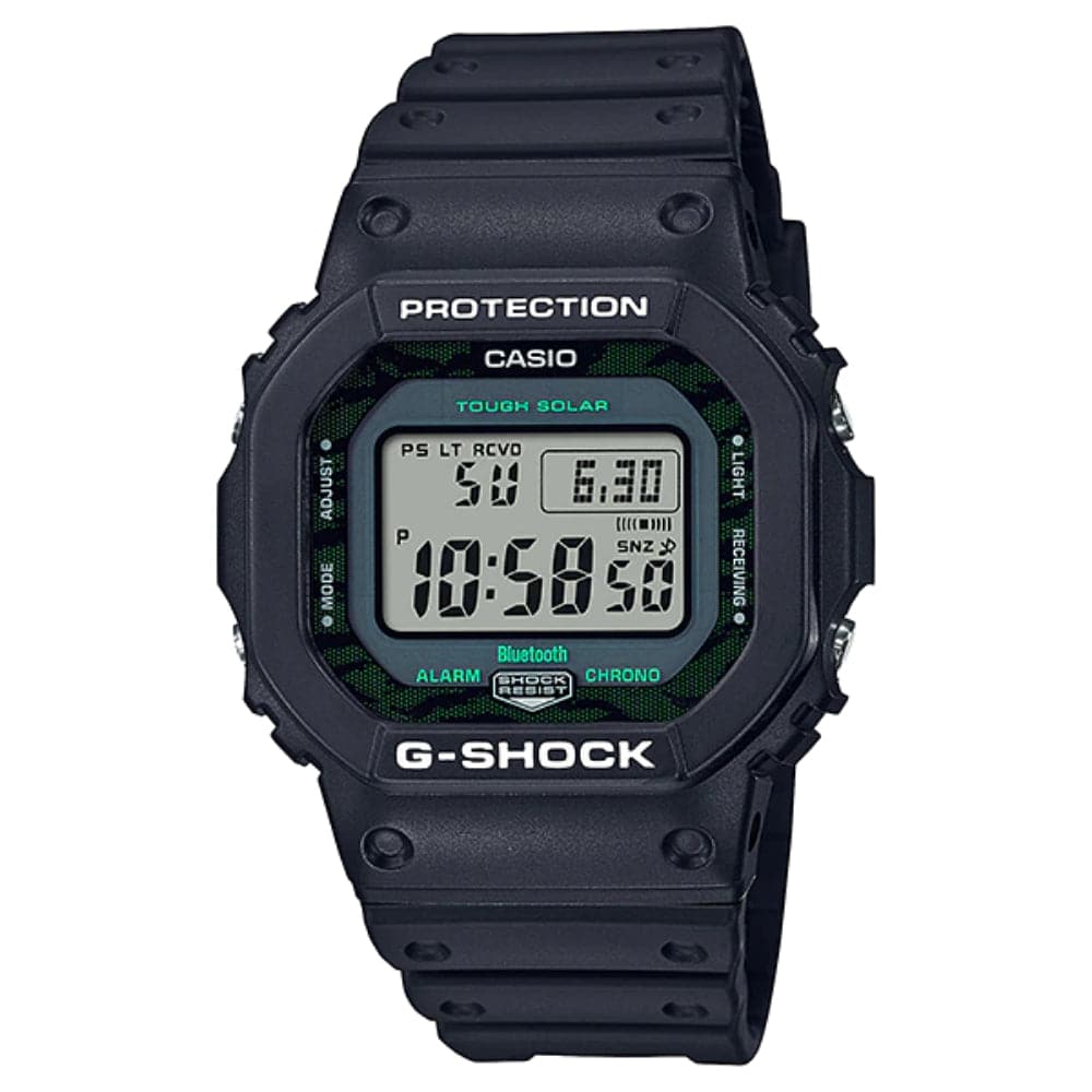 Basic black coloring is accented by the strip camouflage on the dial of the GW-B5600MG. White lettering combines with the green coloring to create a sporty look that is very much part of the G-SHOCK brand.