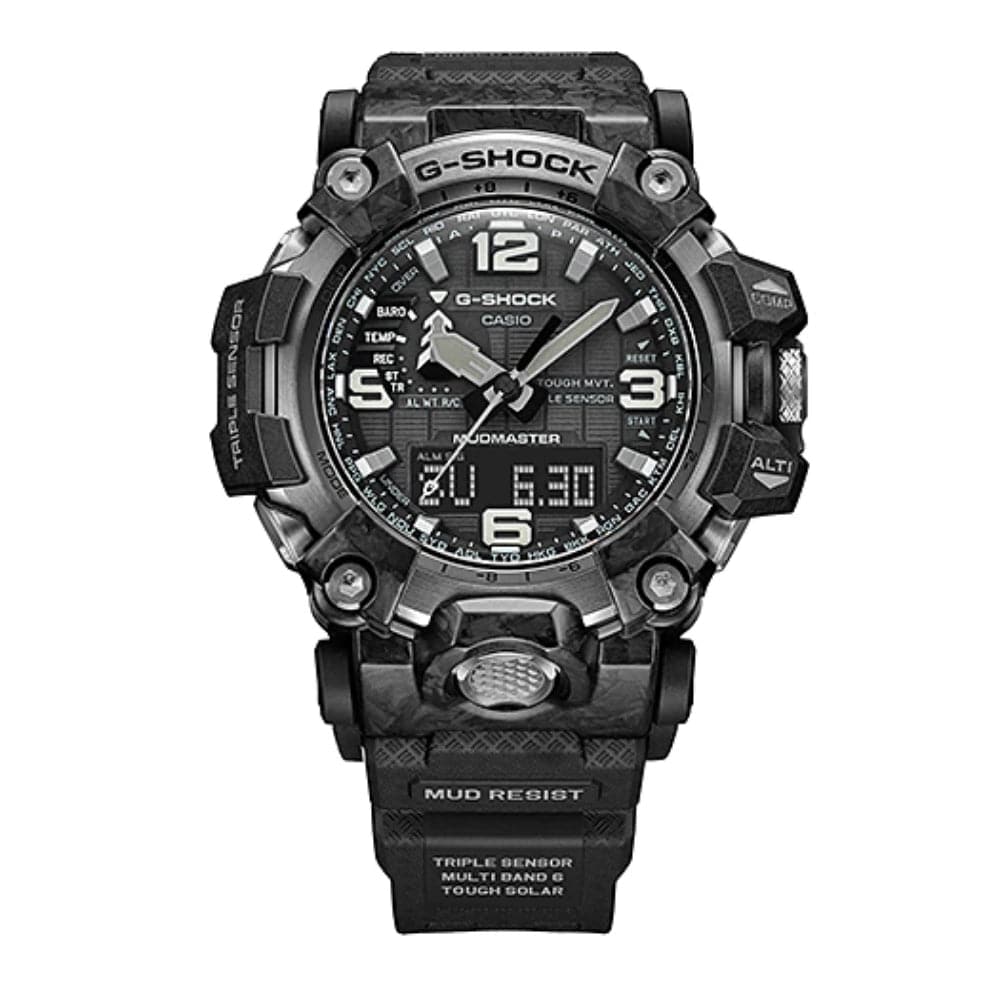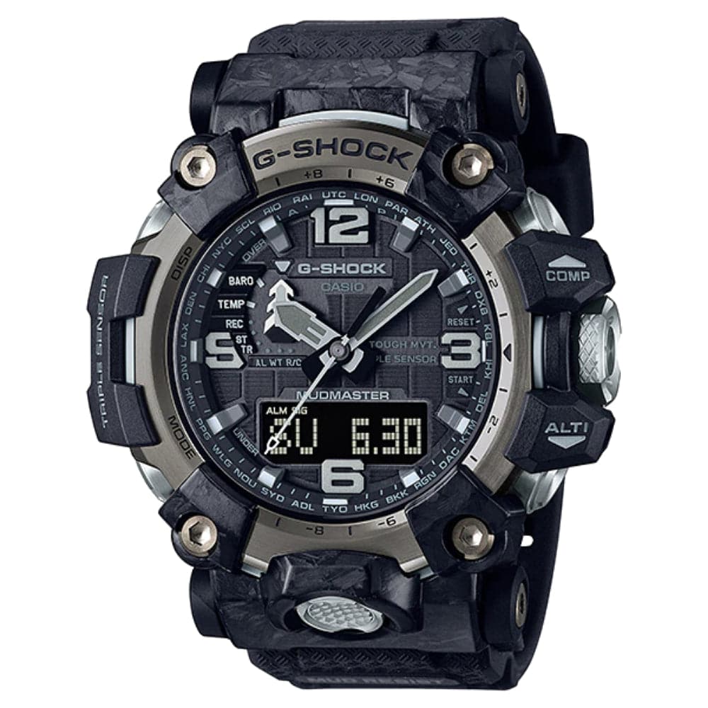 This compact design is made possible by the forged carbon bezel, carbon core guard case structure, and mud-resist buttons combined with stainless steel pipes and silicone buffers. Finely powdered carbon fiber is kneaded into resin, then heat-pressed to mold a bezel that is more complex, yet even stronger than before.