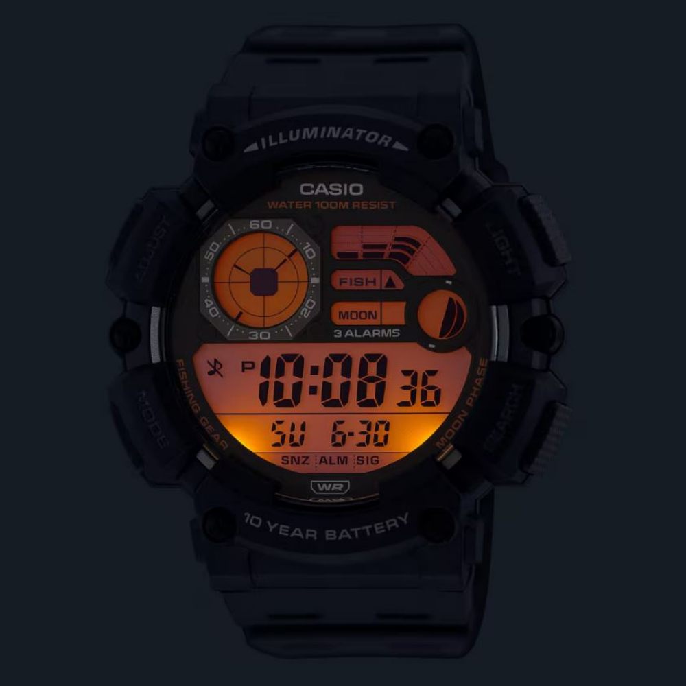 Complete with 10-year battery, water resistance up to 100 meters, LED light, and dual time display, these watches are always at the ready. The moon phase and fishing level indicator s deliver just what you need when you're out on the water.