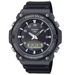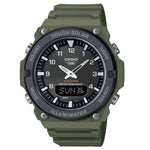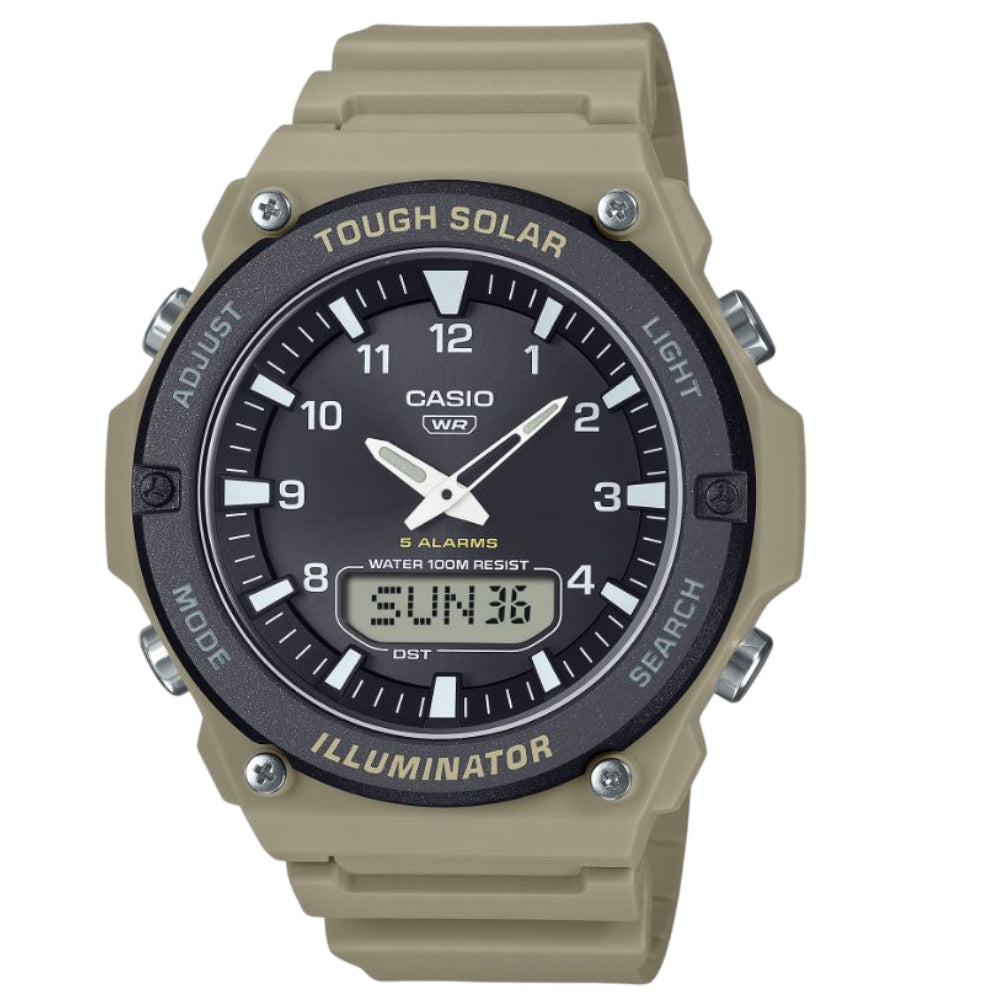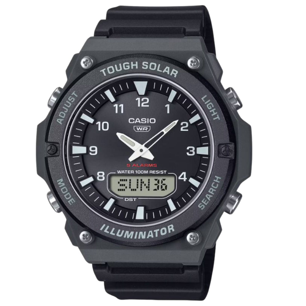 The round, flat bezel is paired with indexes and watch hands in white for easy-to-read visibility. The handy LCD at the 6 o’clock position displays the date, day, and world time.