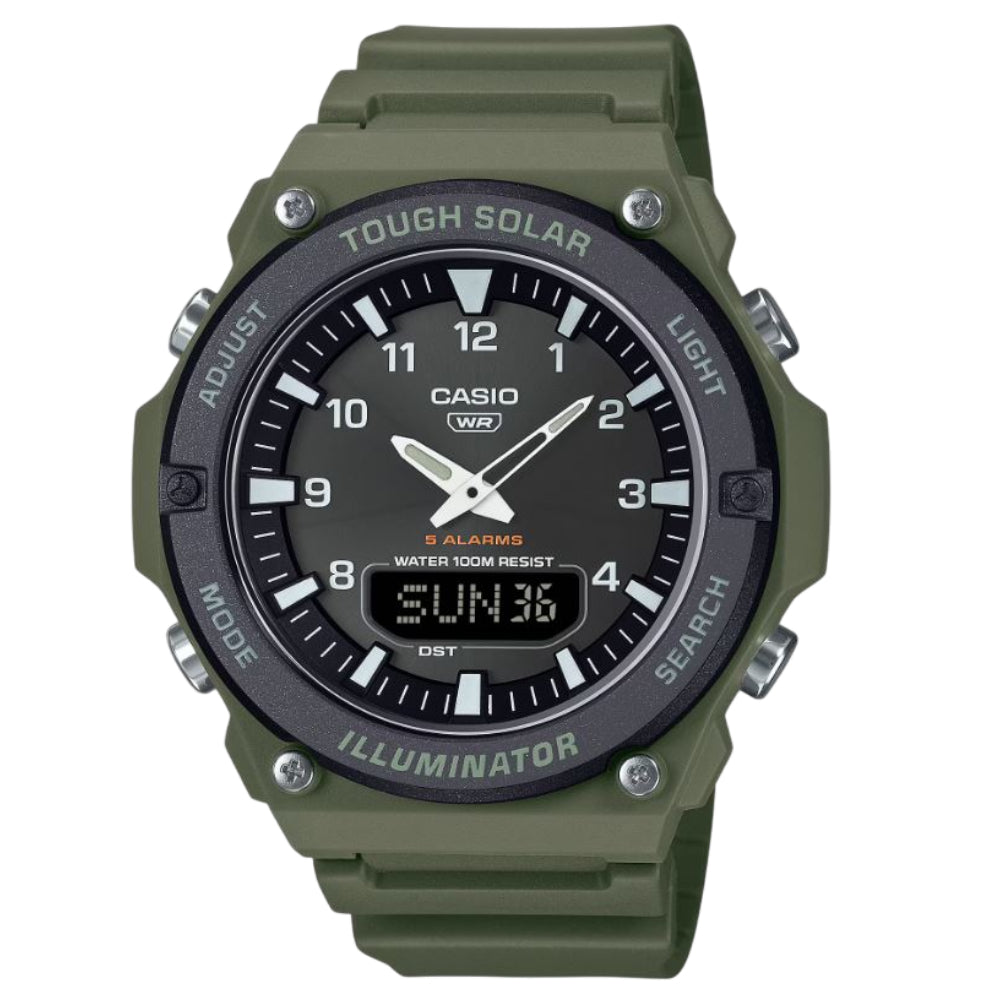 A solar-powered, 100-meter water-resistant watch inspired by the design of aircraft instrument panels.