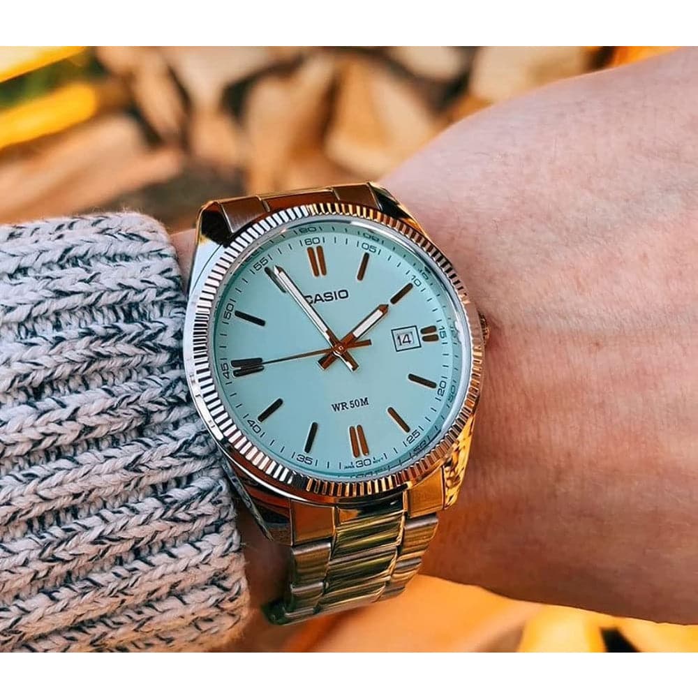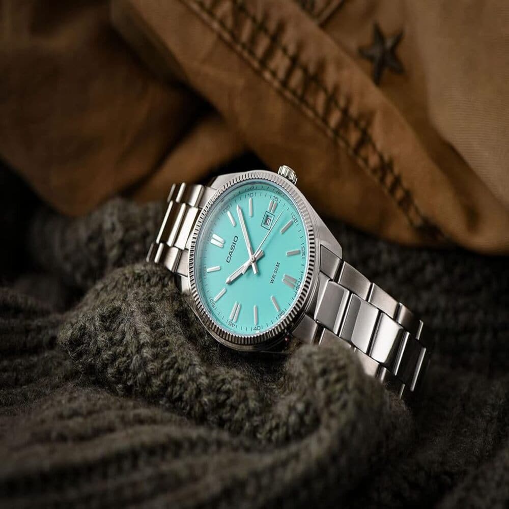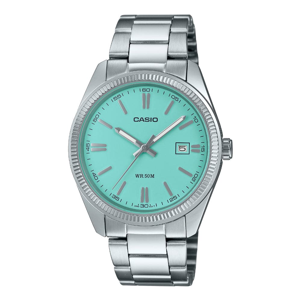 Elevate your style game with the MTP-1302PD-2A2V. This timeless simple silver watch features a stunning turquoise blue dial that is complemented by luminous hands and markers, providing easy readability in low-light conditions. It is designed with a sleek stainless-steel case and band, making it both sophisticated and durable.
