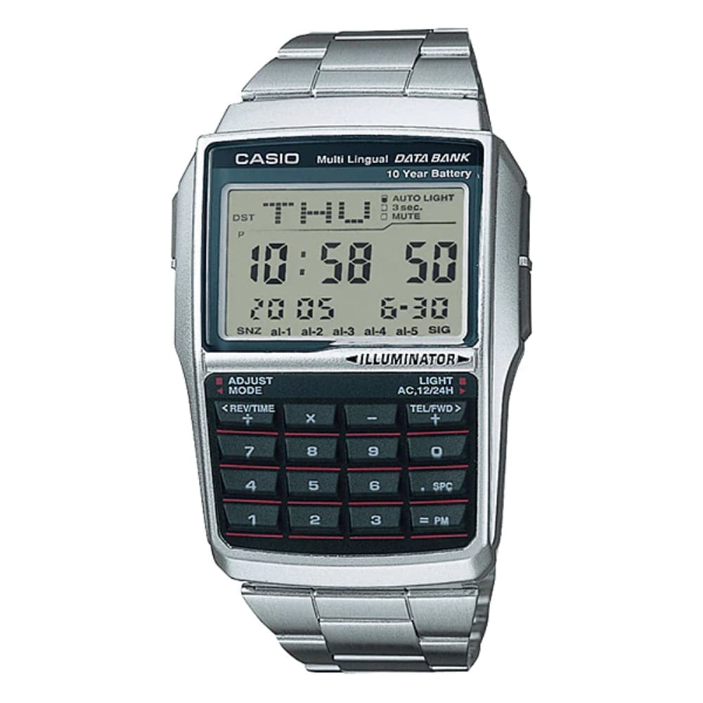 Combine a digital timepiece with a 10-key pad calculator and you get all the convenience of an 8-digit calculator in a wristwatch. A big, high-contrast LCD makes figures easy to read. Other features include databank capabilities, day of the week display in 13 languages, and 10-year battery life for uninterrupted operation.