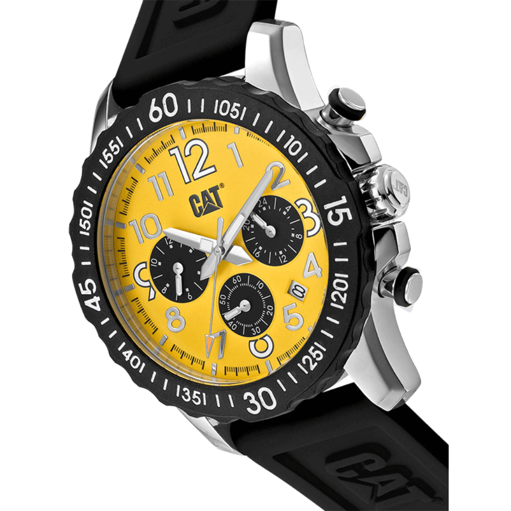 The “Downforce Multi” watch enhances the motorsport-inspired design with a multi-dial movement, along with a numbered bezel from 1 to 60. Available in Cat yellow, black, and silver, it offers options for both silicone straps and stainless steel bracelets for a versatile finish.