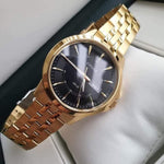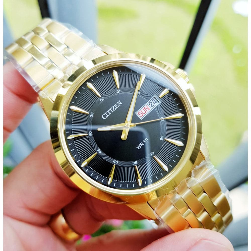 Come back to the originals, this Day and Date Citizen Quartz watch is a classic reinvention, the large Day and Date window, the circular pattern on the dial running along the minute tracker and the asymmetrical kite shaped indexes are the distinguishing features of this super popular style. Features a black dial and a gold-plated Stainless Steel multilink bracelet. Citizen Quartz watches are powered by high precision Quartz movement, which is Made in Japan, they are extremely reliable and have very low Maintenace to give you accurate timekeeping effortlessly.