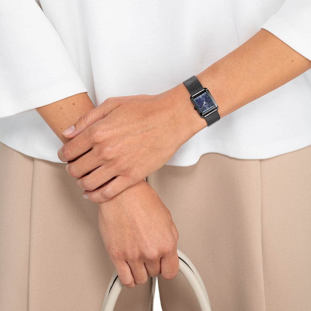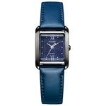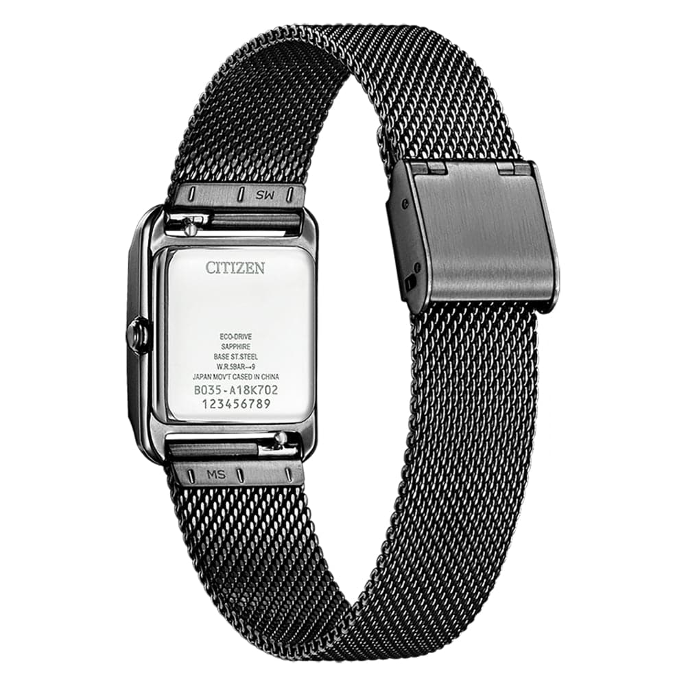 Citizen L Square Collection EW5597-63L - ladies watch produced by Citizen. It is equipped with Japanese solar quartz movement and B035 calibre. Stainless steel, hard coating case of rectangle shape. Case dimensions are 21.5 mm. in diameter and 7.5 mm. in thickness. The dial of this Citizen watch is blue. Display type: analog. This timepiece has sapphire glass. Stainless steel, hard coating, synthetic leather (ecopet®) band, band color: gray, blue. 50 m. water resistance.