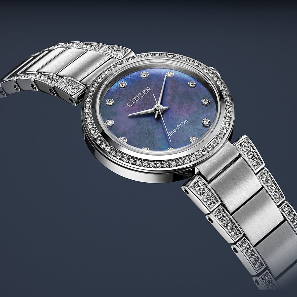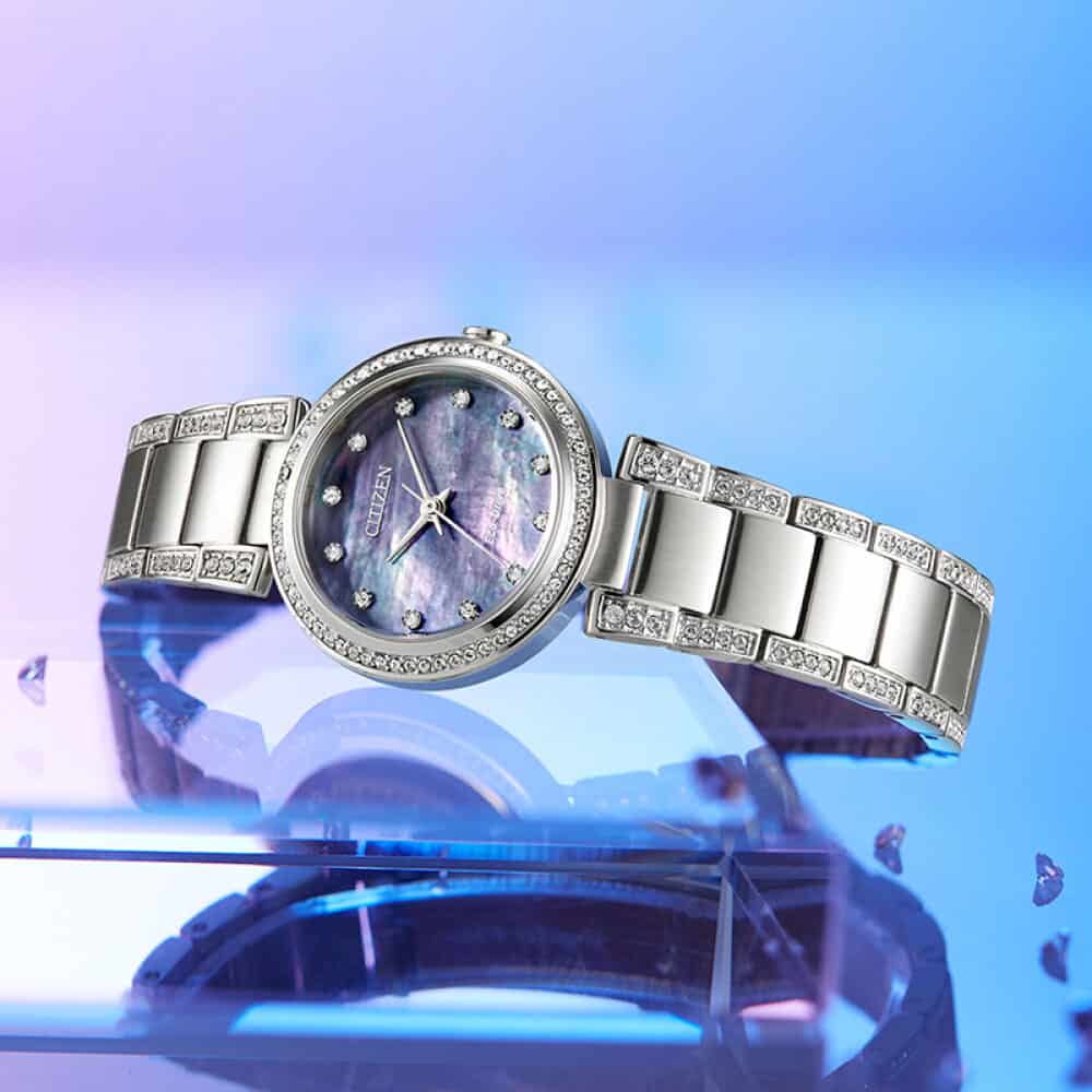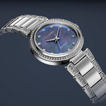 Turn heads with this sophisticated timepiece for your collection. Delicately featuring crystals crafted on the bracelet. Additional crystals adorn the bezel and mother of pearl dial completing the statement. The three hand dial makes an eye-catching accessory that will effortlessly move between business and leisure, and will always be in style.
