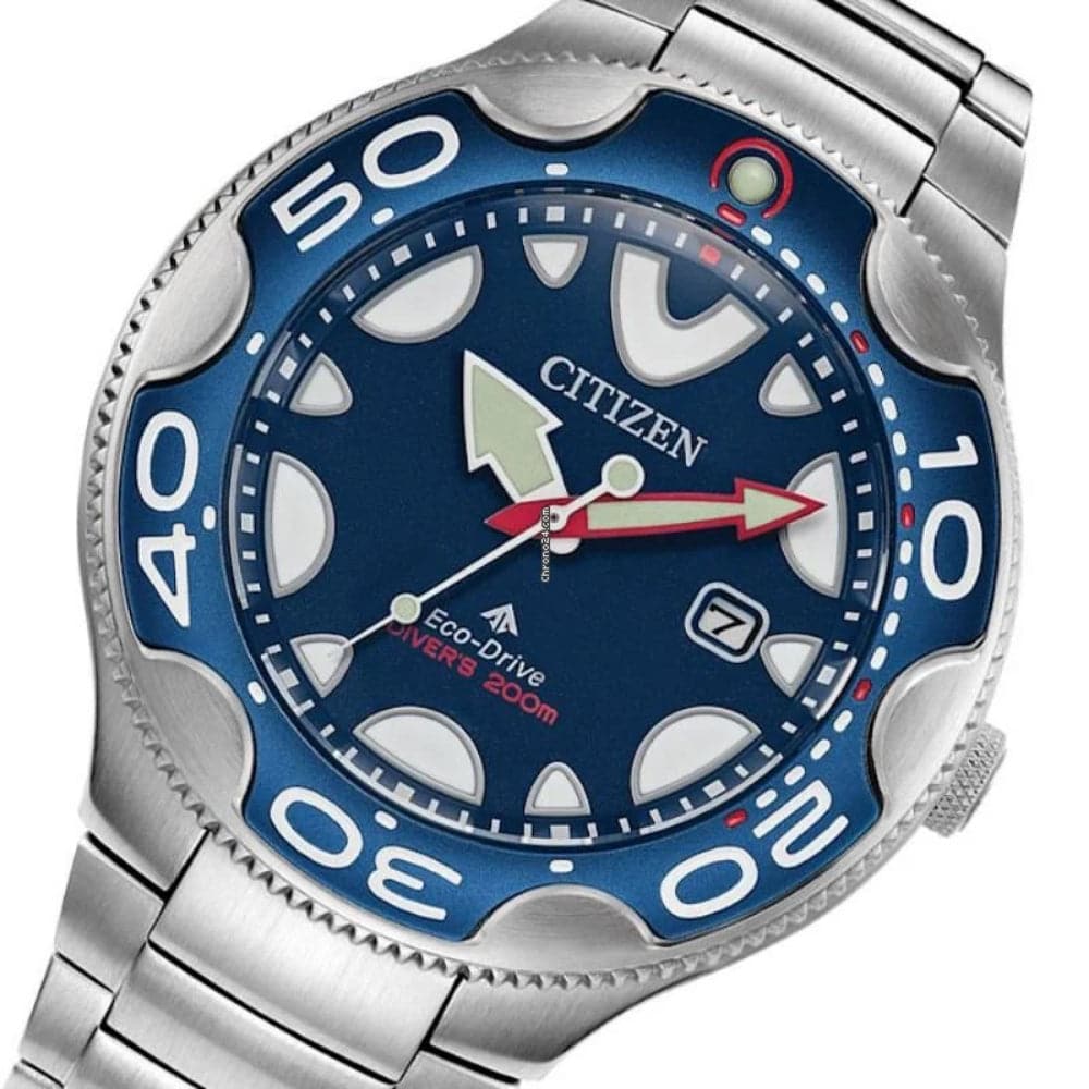Command the sea in style with the Promaster Dive, featuring a new silver-tone stainless steel bracelet design. This iconic Citizen men’s dive watch is the latest addition to the Promaster Sea collection, with a strikingly original design inspired by the majestic Orca whale. The highly functional, sporty dive timepiece features a silver-tone stainless steel case accented by a blue 3-hand dial and date with elliptical white hour indices and bezel indentations that evoke the shapes of the Orca, plus pops of color at the 12 o’clock marker and minute hand. This ISO-compliant dive watch also features anti-magnetic and anti-shock resistance, a one-way rotating elapsed-time bezel, and luminous hands and markers filled with superior luminosity for legibility. The silver-tone stainless steel bracelet fastens with a fold-over clasp with push buttons, and the watch is water resistant up to 200 meters with a screw-down crown, making it a perfect companion on your next dive. Sustainably powered by any light with Eco-Drive technology that never needs a battery, this is the ultimate dive watch to own and comes in a unique scuba tank-inspired box for the serious diver and collector.