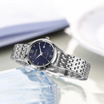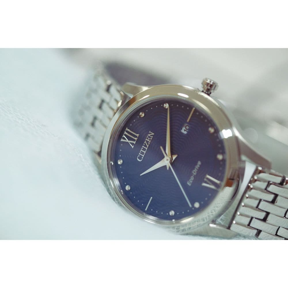 Even though it already possesses classically stylish silver highlights across the sturdy stainless steel band, case and bezel, when you look closer at this watch you will be captivated by the mesmerizing aquamarine blue face with its intricate design effect inspired by the gentle ripples in a pond. Featuring date display, push button buckle and lightweight, battery free construction with Eco-Drive, it is a modestly compelling piece.