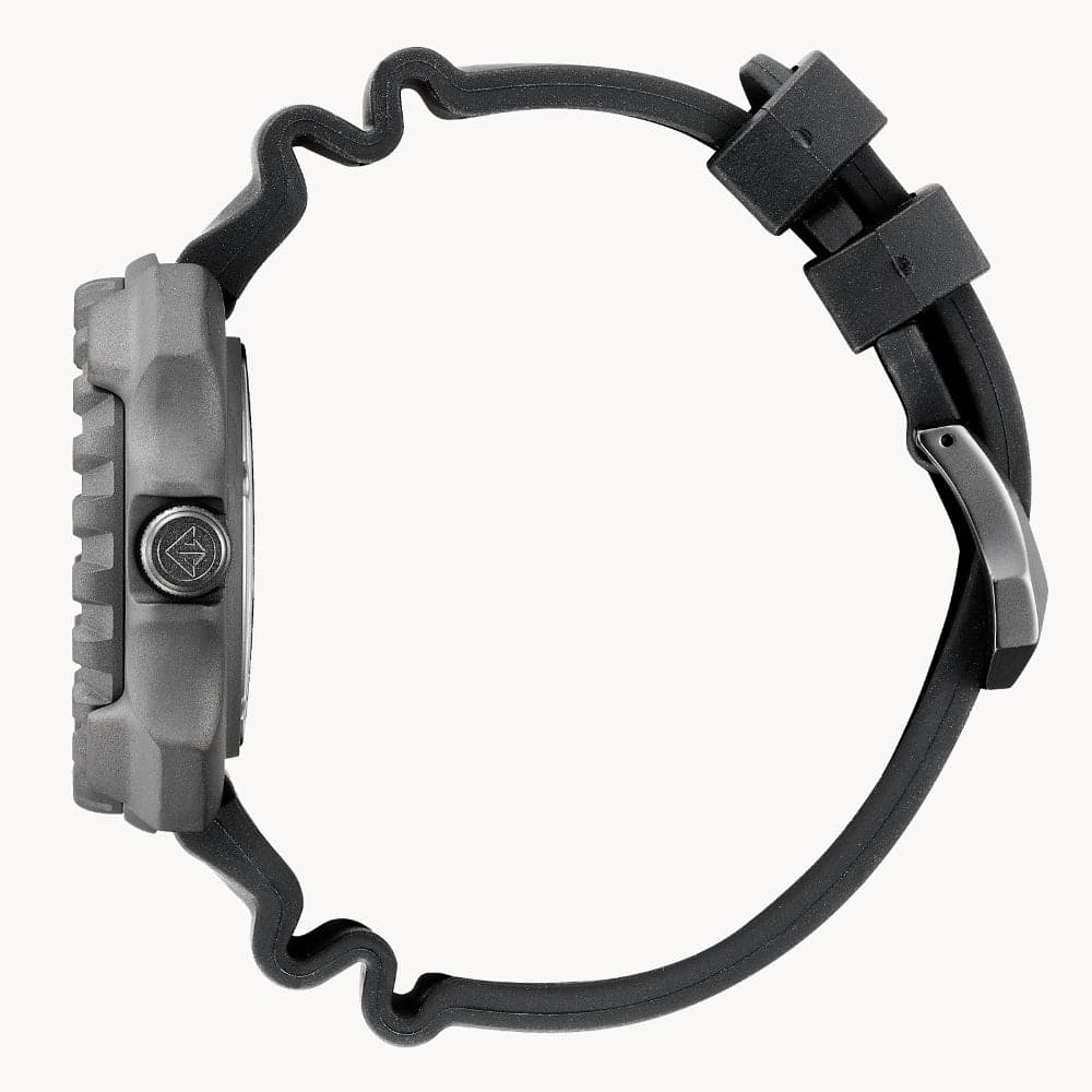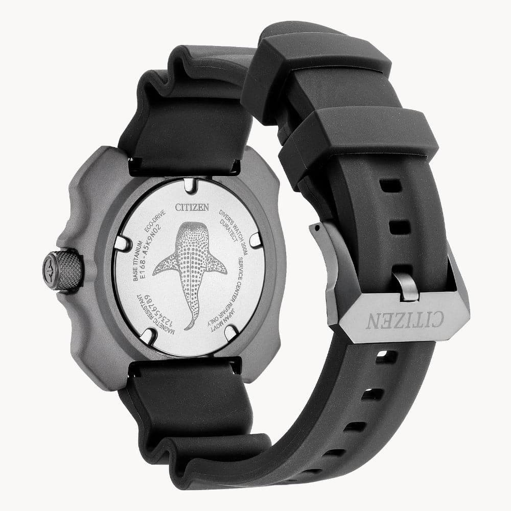 Reaching new depths of advanced design and function, our limited-edition Promaster Super Titanium™ Dive watch from the Promaster Sea collection arrives with high-performance style. Only 5,000 of these timepieces have been made worldwide.* Featuring a gray Super Titanium™ case with DLC coating and sand blasting and a deep blue three-hand dial and date with luminous hands and markers, this watch possesses a variety of features to make your dive more epic. It’s ISO compliant with an anti-magnetic, anti-shock movement, and a one-way rotating elapsed-time bezel. The black polyurethane strap fastens with ease and like other watches in the Promaster line, it is water resistant up to 200 meters. Powered by Citizen’s Eco-Drive technology and using any light source, it never needs a battery. Whether on land or in the sea, this timepiece will make your adventure stand out. *The limited-edition pieces are unnumbered.