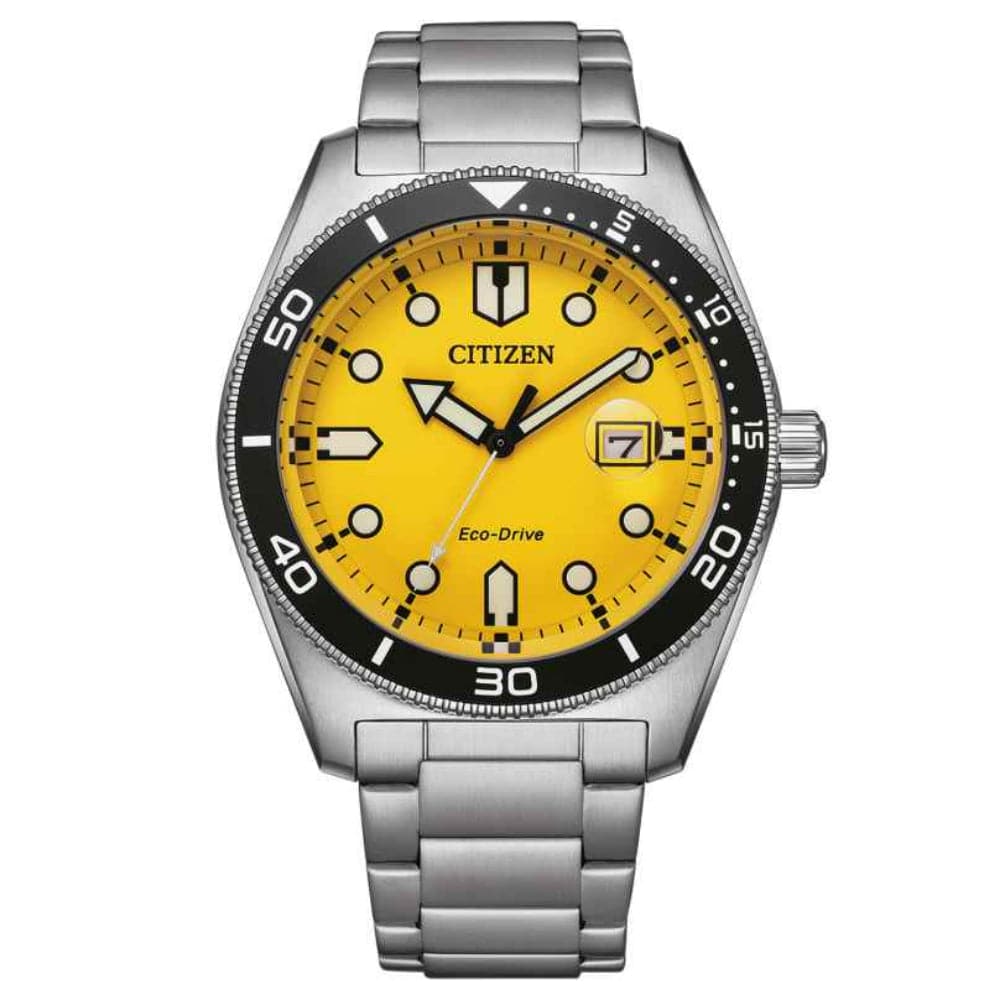 Sport meets luxury with the new Citizen Eco-Drive. Versatile and easy to wear for any occasion, this timepiece features a stainless-steel case, canary yellow dial, luminous hands and stainless-steel bracelet. Additional features include mineral crystal, fold-over double-push closure and water resistance of 100 meters.