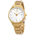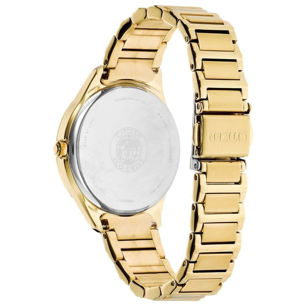 Yellow gold-tone stainless steel case and bracelet. Fixed yellow gold-tone bezel. Silver dial with yellow gold-tone hands and crystal-tipped index hour markers. Arabic numerals mark the 6 and 12 o'clock positions. Minute markers around the outer rim. Dial Type: Analog. Date display at the 3 o'clock position. Citizen caliber Eco-Drive J810 quartz movement. Scratch resistant mineral crystal. Pull / push crown. Solid case back. Round case shape. Case size: 37 mm. Case thickness: 9 mm. Band width: 14 mm. Band length: 7 inches. Fold over clasp with a push button release. Water resistant at 50 meters / 165 feet. Functions: date, hour, minute, second. Casual watch style. Watch label: Japan Movt. Citizen Chandler Crystal Eco-Drive Silver Dial Ladies Watch FE6102-53A.