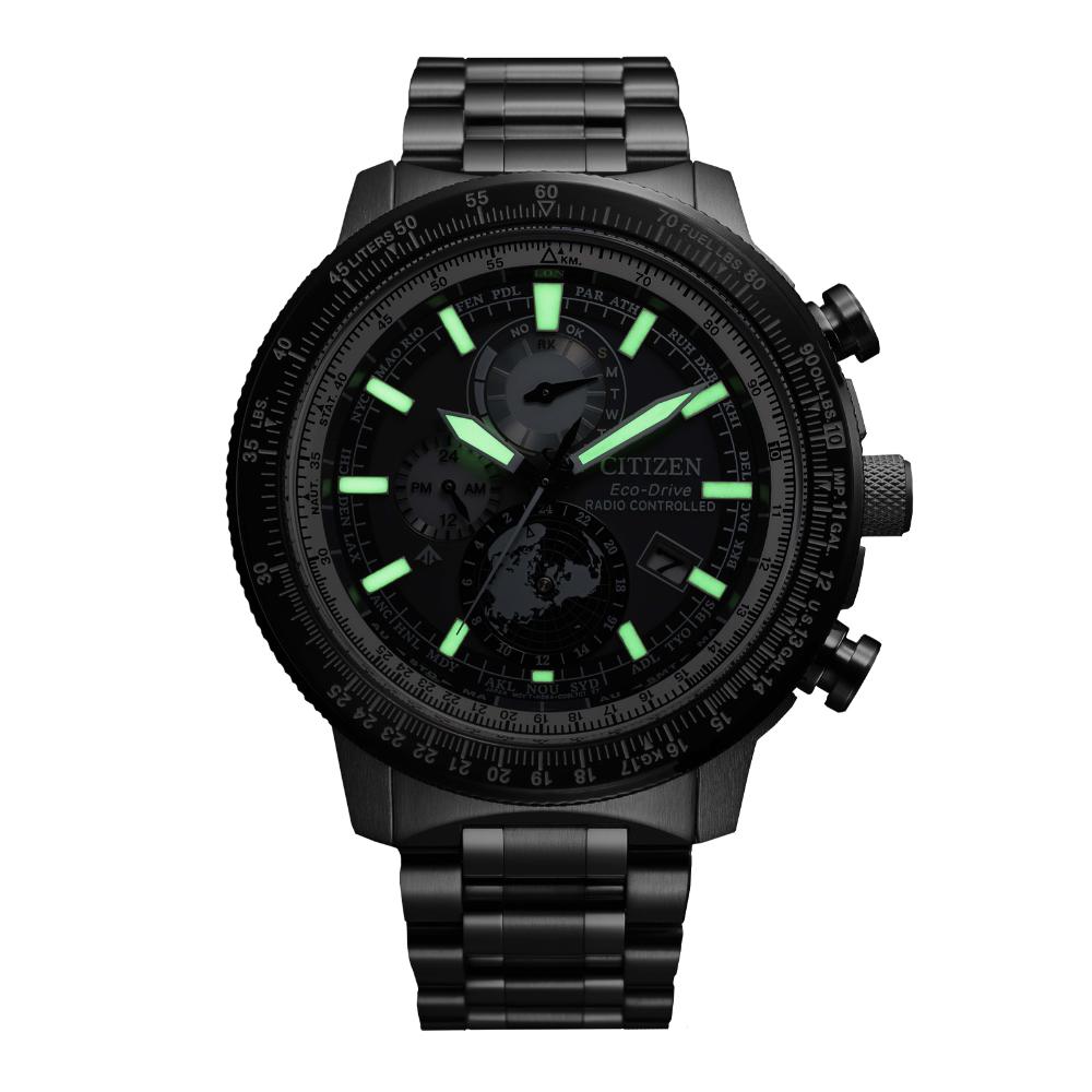 Touch the edge of the sky with the new Promaster Air Geo Trekker, featuring global Radio Control timekeeping for exceptional accuracy. A striking 46mm stainless steel case in silver-tone centers the design, with the professional-grade pilot’s watch mission-ready on the wrist – fully equipped with a bold set of chronograph pushers, 5-link stainless steel bracelet, and an outer slide rule bezel.