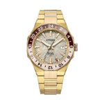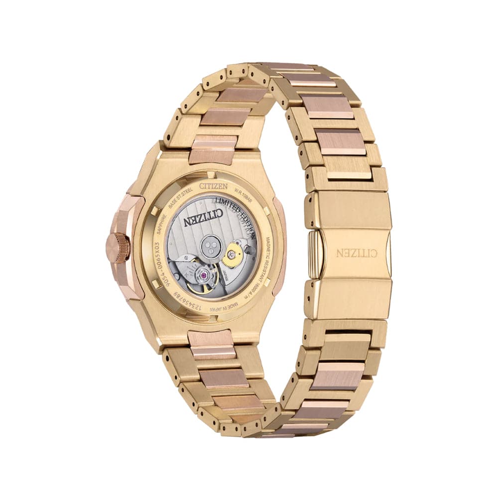 Delicate. Bold. Unprecedented. Bringing the colors and brilliance of Japanese seasons to your wrist, Citizen welcomes this new Limited Edition 880 Mechanical to the Series 8 Collection. With the "Four Seasons" design concept, this model—Limited to 1,300 pieces worldwide, focuses on the warmth of Fall with a two-tone yellow gold and warm gold case and matching bracelet to interpret the shades of autumn leaves. A distinct and iconic dial pattern, unique to this Limited-Edition model, was developed to express Japan's original scenery, which shines golden in the setting sun. Equipped with a newly developed mechanical movement "Cal. 9054" with GMT functionality, the new and improved range offers a high-accuracy and anti-magnetic movement with a 50-hour power reserve that can withstand generated magnetic force from everyday electronic devices as close as 1cm without affecting its timekeeping accuracy. Adopting a four-body structured case design, bi-rotational Autumn-themed bezel and two-piece center case structure, this new GMT model creates an authentic sporty classic aesthetic suitable for the way we live now. The 880 Mechanical showcases the beauty of precision through a see-through case back to emphasize the strength, elegance and identity of the Series 8 collection. The GMT range's tapered stainless-steel bracelet has been applied with a rough hairline on a flat surface to demonstrate a modern luxury look and pursue a comfortable fit. Complemented with a sapphire crystal and water resistance of up to 100 meters, the Series 8 GMT continues to explore infinite possibilities.
