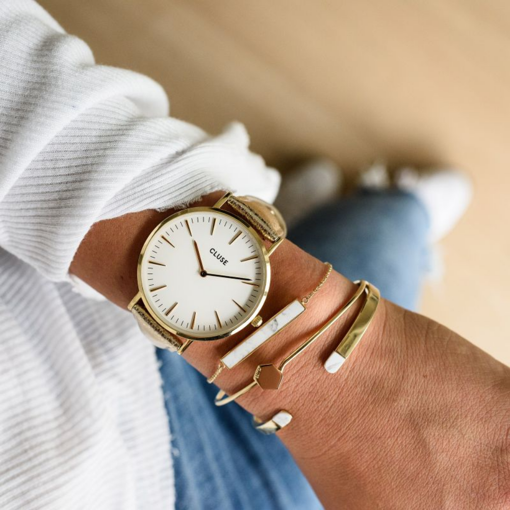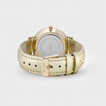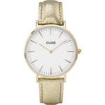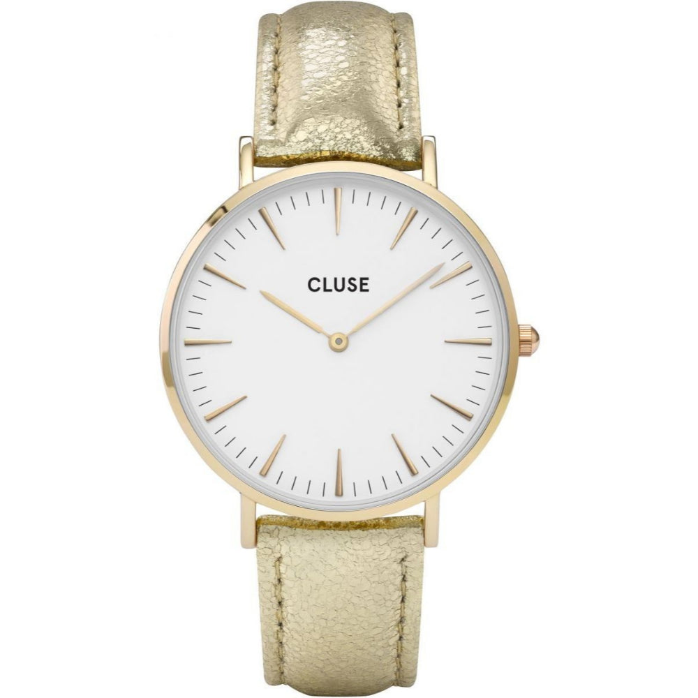 This ladies Cluse La Boheme Gold watch is made from PVD gold plated and is powered by a quartz movement. It is fastened with a gold tone leather strap and has a white dial.