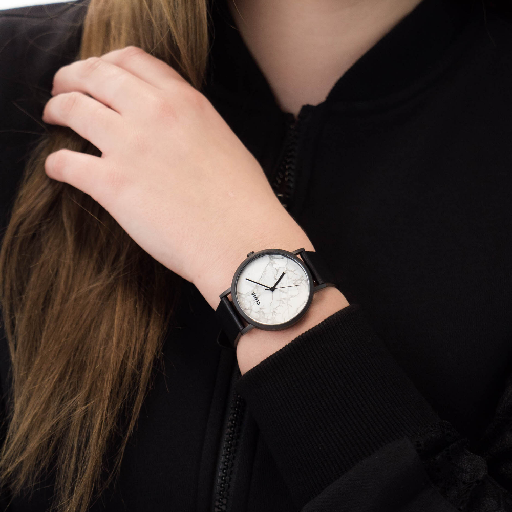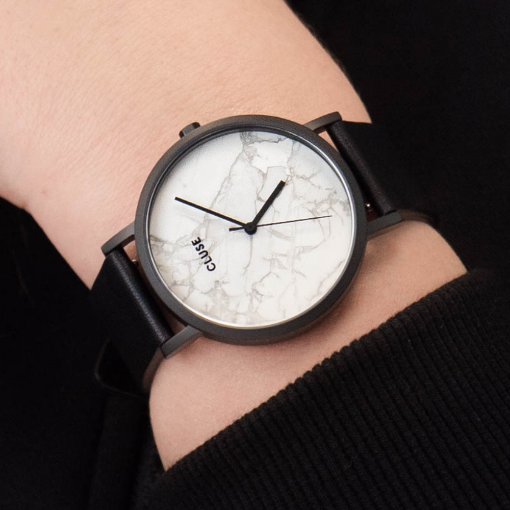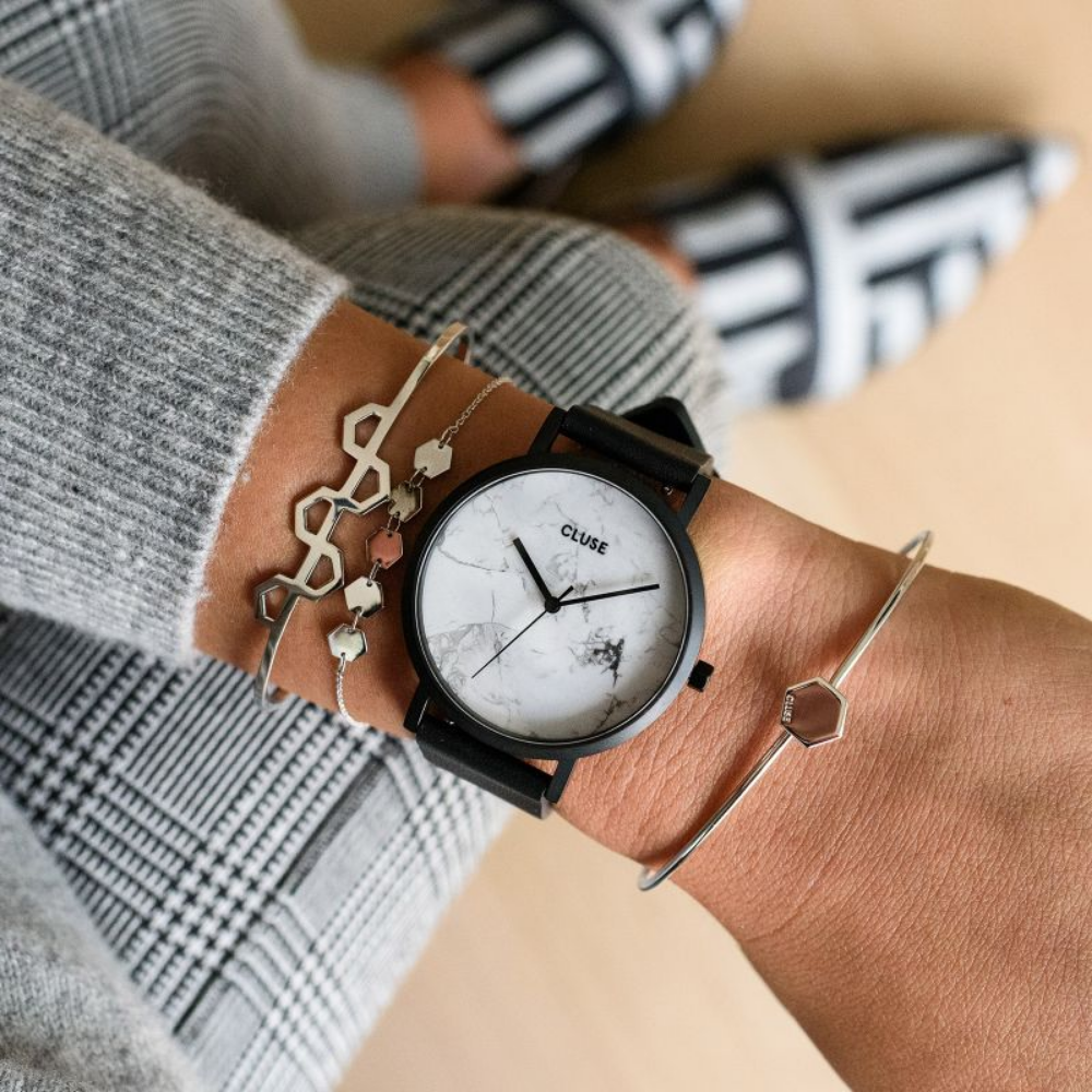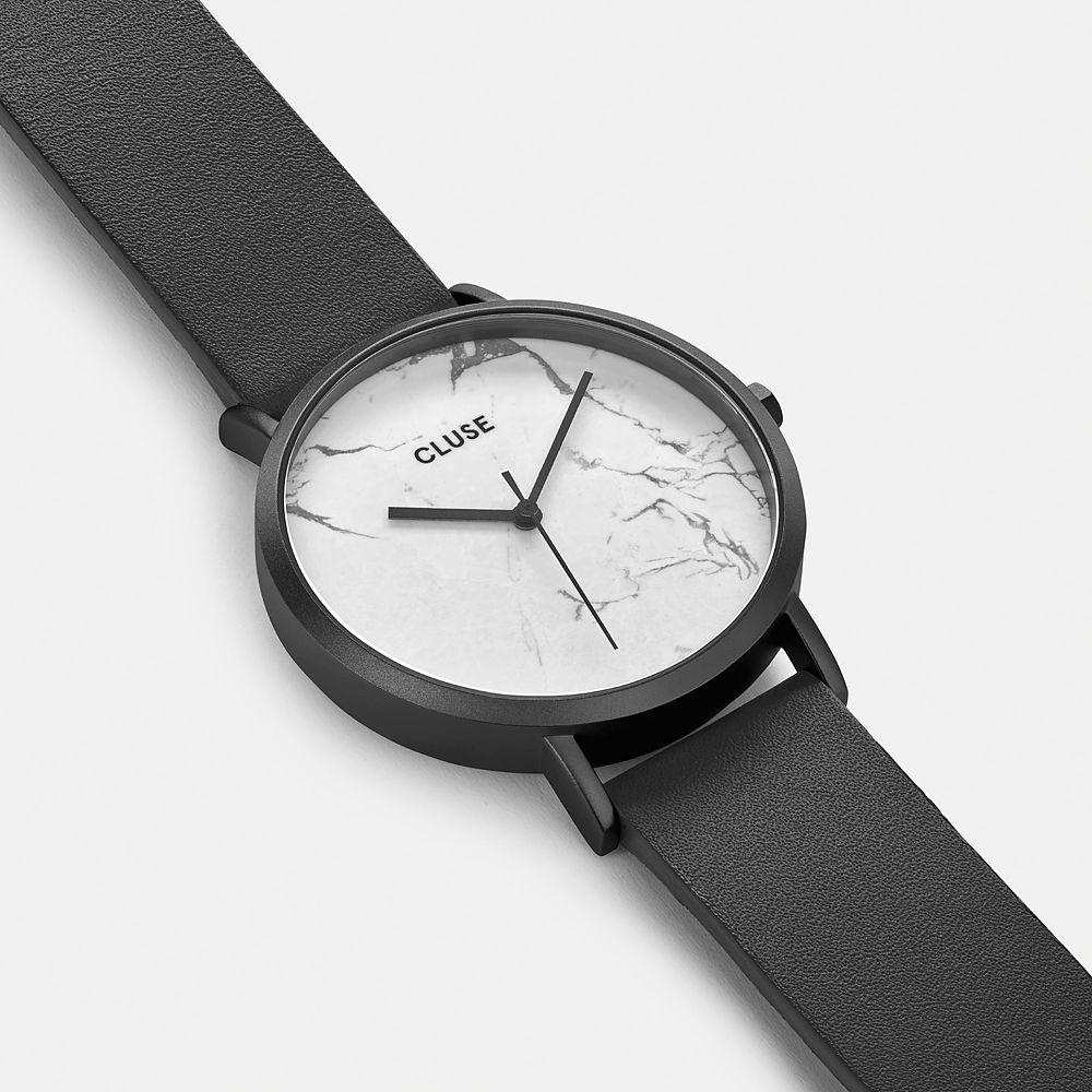 This stunning Cluse La Roche Full Black watch has a black ion-plated steel black ion-plated steel case and is fitted with an analogue quartz movement. It is fastened with a black leather strap and has a white dial.