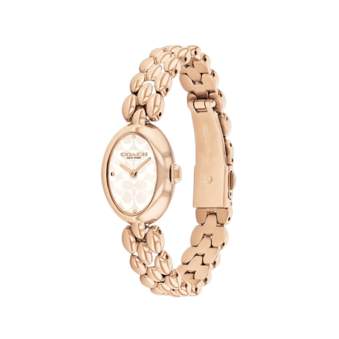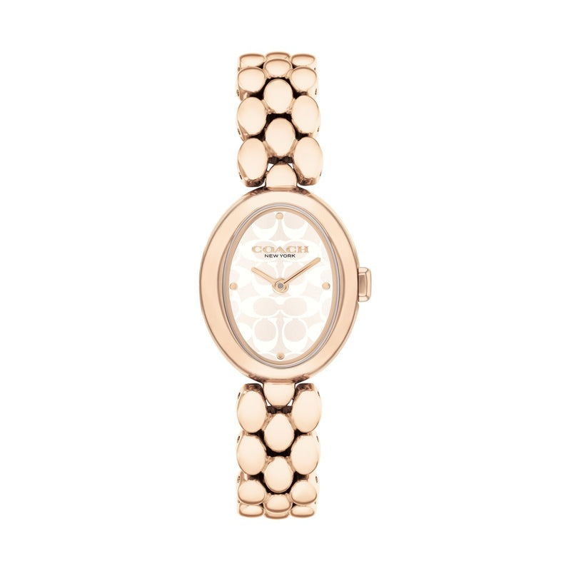 The Coach Sammy Rose-Toned Ladies Bracelet Watch combines timeless sophistication with modern design. Featuring a sleek silver-toned patterned oval dial and a rose-gold bracelet, this timepiece is perfect for any occasion.
