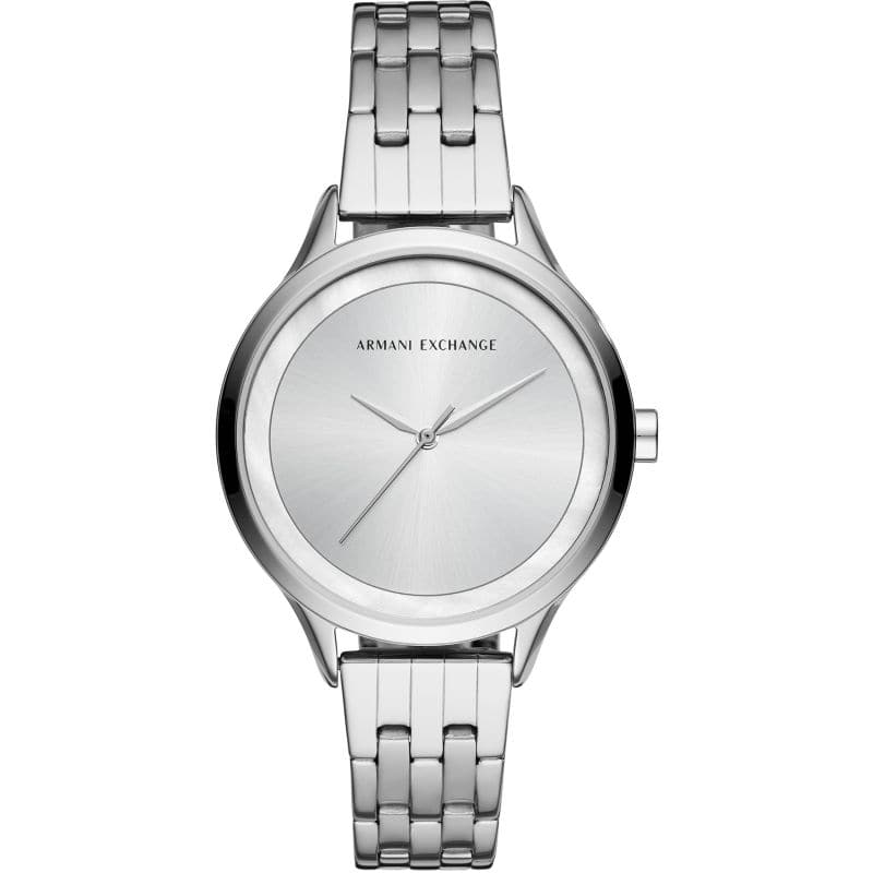 New for fall 2017, this modern Armani Exchange watch features a black sunray dial with a striped inner dial, paired with a black IP case and a camo leather strap.