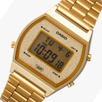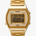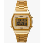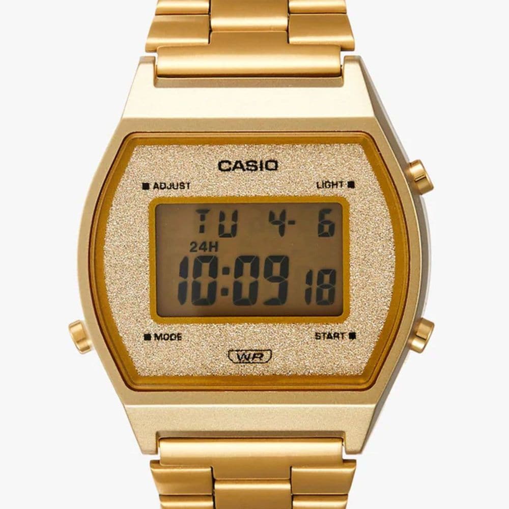 Casio Vintage introduces a whole new color palette of glossy solids into the line-up. With vivid colors, metallic dials and matching LCDs, these new colors are sure to make a splash. Black resin band digital watch with a neutral face.