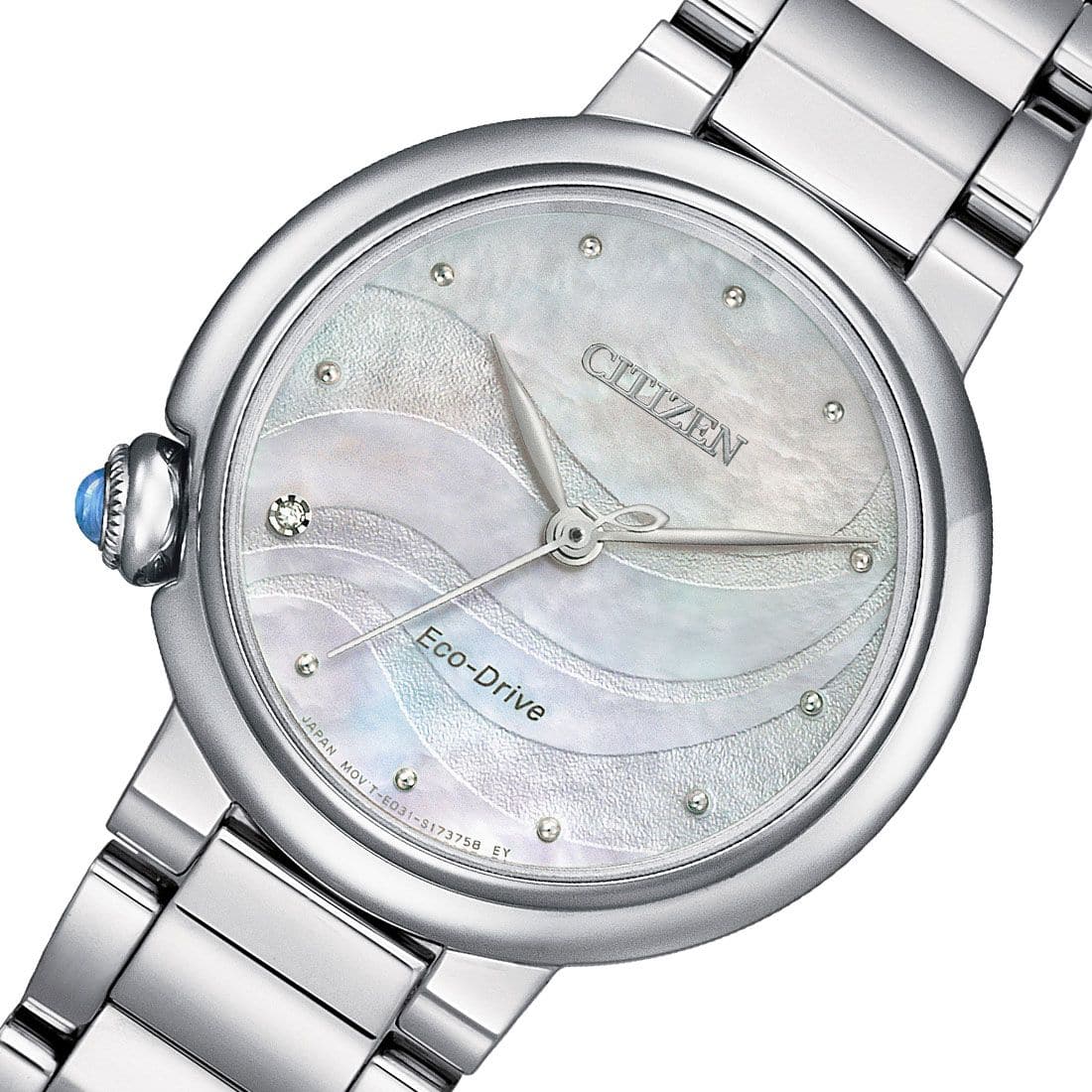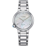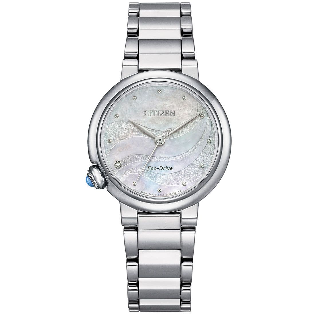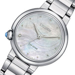 Resilience is always in style with this gorgeous watch crafted from robust stainless-steel and scratch-resistant sapphire glass. Powered by Eco-Drive Technology with 6-months charge kept in supply, it utilizes light energy to function instead of batteries, making it lighter in weight and environmentally responsible. With an exquisite mother of pearl dial set against smooth silver tones, a diamond at 8 o'clock position on dial and a gemstone crown at the 8 o'clock position, this watch sets a benchmark in style for every occasion.