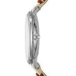 Stainless steel case with a brown woven leather strap. Fixed rose gold-tone bezel. White dial with luminous rose gold-tone hands and Arabic numeral hour markers. Minute markers around the outer rim. Dial Type: Analog. Luminescent hands and markers. Date display at the 6 o'clock position. Quartz movement. Scratch resistant mineral crystal. Pull / push crown. Solid case back. Case size: 36 mm. Case thickness: 8 mm. Round case shape. Band width: 14 mm. Tang clasp. Water resistant at 30 meters / 100 feet. Functions: date, hour, minute, second. Additional Info: in general, withstands splashes or brief immersion in water, but not suitable for swimming or bathing. Casual watch style. Fossil Jacqueline White Dial Woven Leather Ladies Watch ES4209.