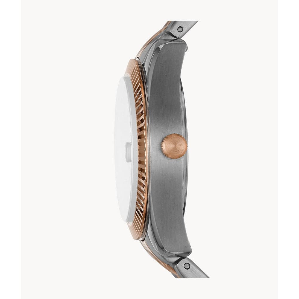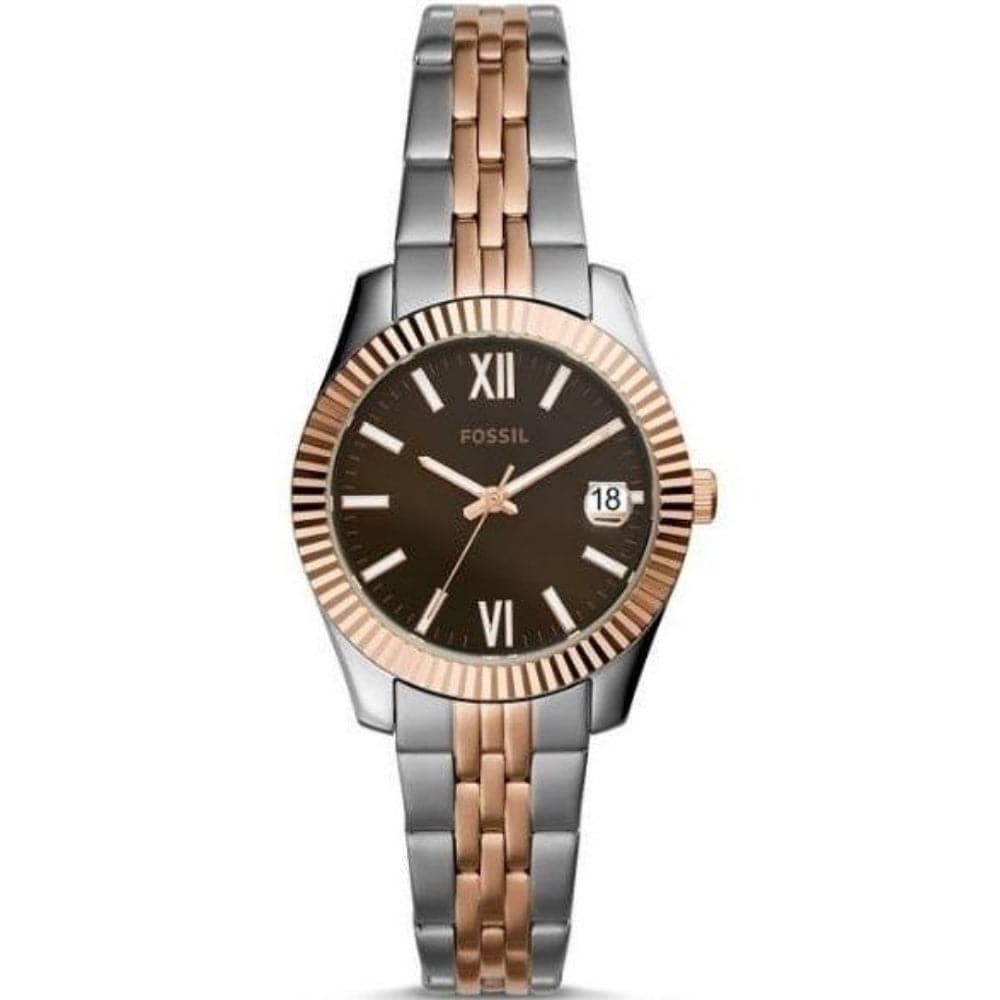 Carry great technology wrapped around your wrist with this stylish women's analog watch from the Scarlette Mini collection by Fossil. Protected by a mineral glass, the brown round dial is housed in a 32 mm case. It displays plain three hands, Roman numerals at the 6th and 12th-hour positions, bold stick indices for the rest of the hours, a date display window and a crown for time adjustment. The stainless steel strap exudes an elegant silver hue that accentuates the look of the watch. Besides, it is completed with a push-button clasp that ensures a secure fit on the wrist.