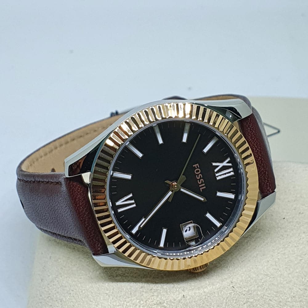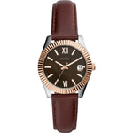 Lending a contemporary twist to an elegant design, this women's analog watch from the Scarlette Mini collection by Fossil is a must-have wrist essential. Its genuine leather strap comes in a shade of brown that elevates the look of the watch. The brown round dial is secured by a mineral glass and is housed in a 32 mm case. It exudes plain three hands, Roman numerals at the 6th and 12th-hour positions, bold stick indices for the rest of the hours, a date display window and a crown for time adjustment.