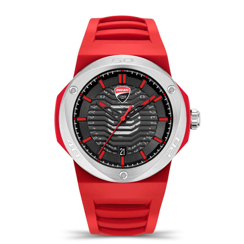 The most powerful watch in Ducati's history with a design reflecting your true racing spirit. It features a black sunray dial with a date window and a stylish silicone strap. With 100 m water resistance, this watch has all the features of a race-ready timepiece.