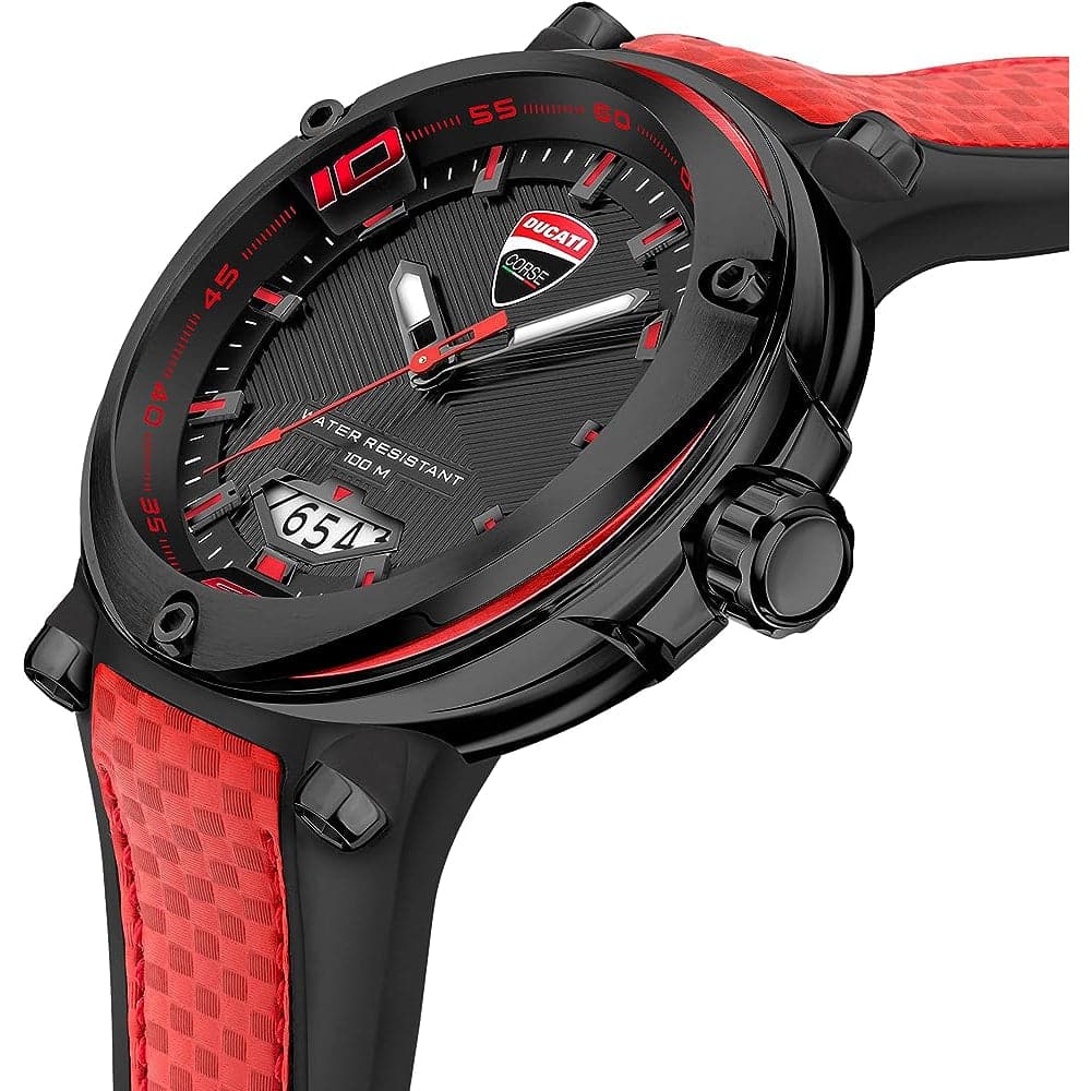 A perfect fusion of style and functionality, this men's analog watch from Ducati is sure to make a style statement. Secured by a mineral glass, the black round dial is housed in a 35 mm case. It exhibits plain three hands and a crown for time adjustment. The silicone strap exudes a black hue that accentuates the look of the watch. Moreover, it is fitted with a buckle clasp to ensure a secure fit on the wrist.