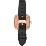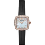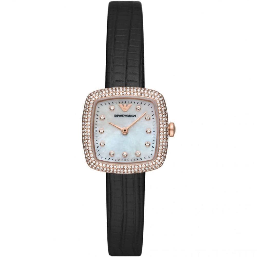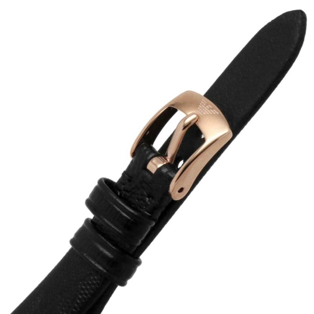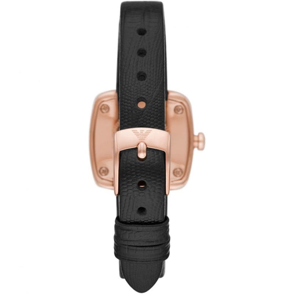 Armani Exchange's 42mm watch features a black skeleton dial, at least 50% recycled stainless steel case and strap buckle, multifunction movement and black leather strap.