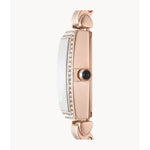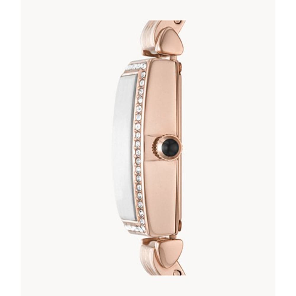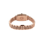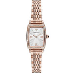 Armani Women's Only Time Watch. Only Time Clock With Rectangular Case Of 21 X 26 Mm And 8 Mm Thickness Made Of Stainless Steel With Glossy Finish, Rose Gold Color. The glass is transparent and the dial is white. The Distance Of The Anse Is 12 Mm. Clock With Crystals On The Dial. The strap is in stainless steel with a glossy finish, in a rose gold color. Bracelet With Deployant Closure. The Resistance to Water is 3 Atm. The Movement Is Quartz / 2 Spheres. The reference is Ar11406