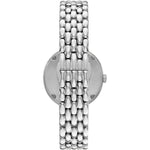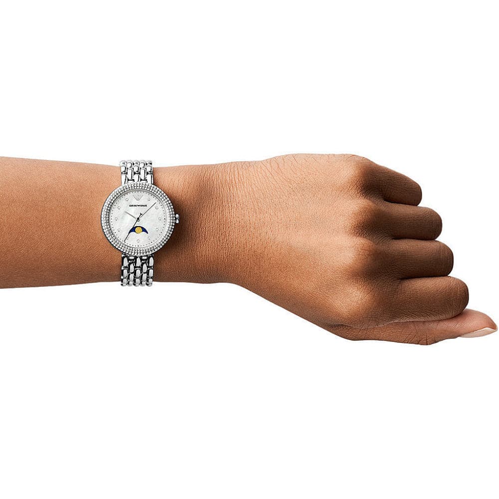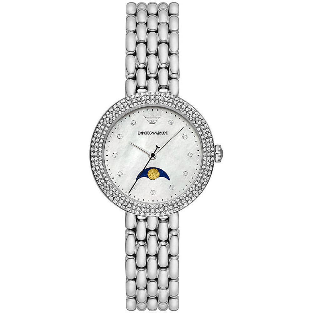 Women's Multifunction Watch By Emporio Armani. Clock With Round Case Of 32 Mm Made Of Stainless Steel Of Silver Color, With Matte Finish. The thickness is 7 mm. The glass is transparent. The dial is multicolored. The Distance Of The Anse Is 14 Mm. There are crystals on the dial. The bracelet is made of silver-colored stainless steel with a glossy finish. The Closure Is: Deployant Closure. The Resistance to Water is 3 Atm. The Movement Is Quartz / Multifunction. This 32mm Emporio Armani Watch Features A Polished White Mother Of Pearl Dial, Moon Phase Movement And Steel Bracelet.