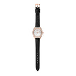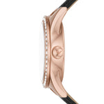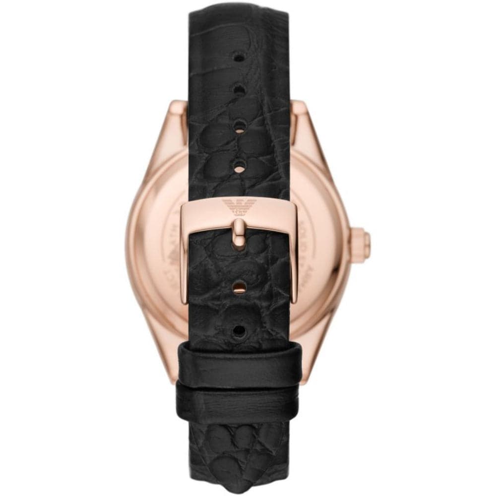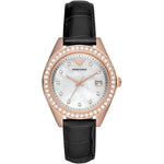 Emporio Armani's 36mm watch features a white mother of pearl glossy dial, at least 50% recycled stainless steel case, three-hand date movement and black leather strap.