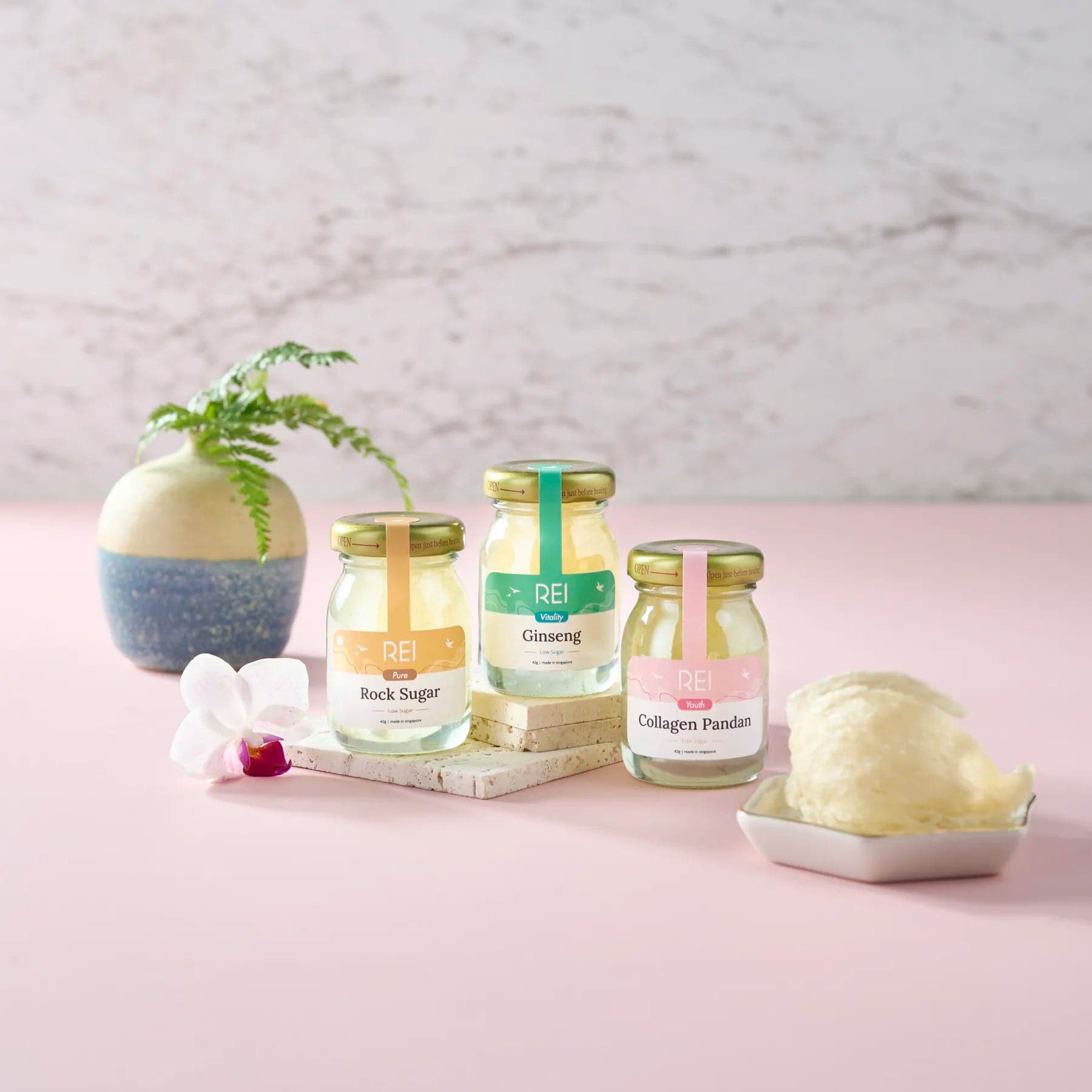 All of Rei's bottled bird's nest are made with 100% genuine bird's nest that is sourced from ethical and sustainable farms. Free of preservatives and artificial flavors.