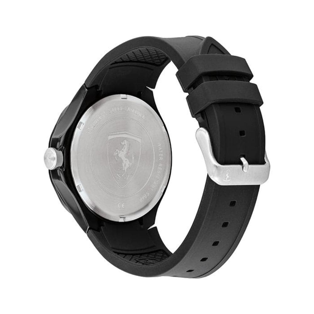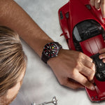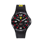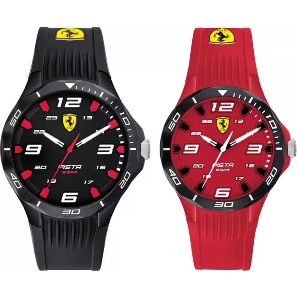 This set of 48mm & 38mm sporty Pista watches embodies the high-energy thrill of motor-racing with thermoplastic cases, notched bezels and silicone straps, punctuated with the Scuderia Ferrari Prancing Horse Shield and aerodynamic lines inspired by race car air diffusers. Beneath the mineral glass, is a racing-inspired dial design which features large indexes and numerals for bold, sporty character. A timepiece that fails to go unnoticed, Pista is worthy of a place on the wrist of any true Scuderia Ferrari racing fan.