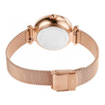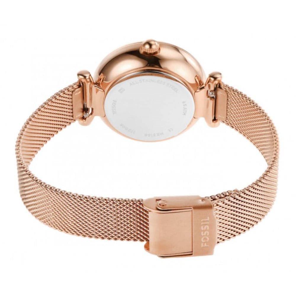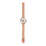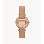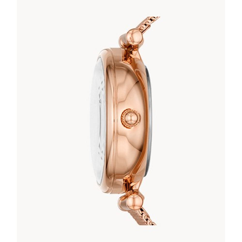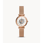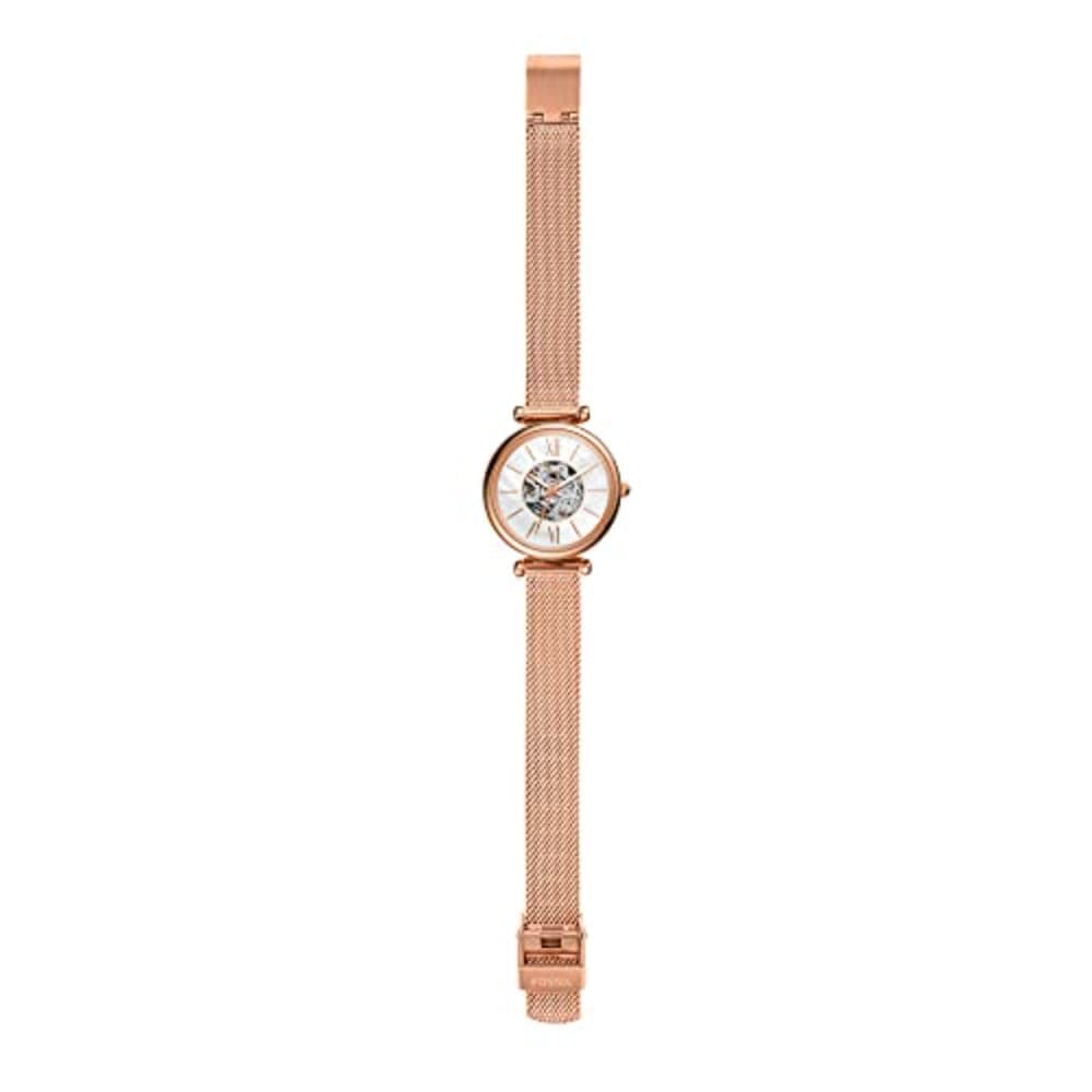 Fossil's fine stainless steel Carlie mini watch features slim geometric simplicity with an exceptionally beautiful Mother of Pearl dial with a studded top ring. Roman and linear indexes add to it's glamour. This 28 mm Carlie Mini watch feature Automatic movement. It is completed with a rose gold-tone tone stainless steel bracelet with a 2 pusher fold over clasp.