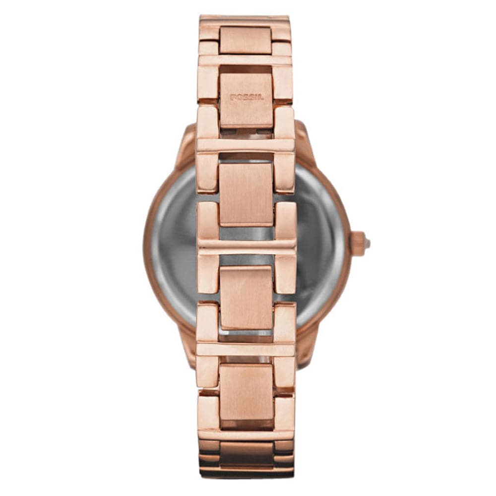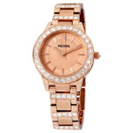 Rose gold-tone stainless steel case and bracelet set with crystals. Fixed rose gold-tone bezel set with crystals. Rose gold dial with rose gold-tone hands and index hour markers. Crystal-set index marker at the 12 o'clock position. Dial Type: Analog. Luminescent hands and markers. Quartz movement. Scratch resistant mineral crystal. Solid case back. Case diameter: 34 mm. Case thickness: 8 mm. Round case shape. Band width: 15 mm. Deployment clasp with a push button release. Water resistant at 50 meters / 165 feet. Functions: hour, minute, second. Casual watch style. Watch label: Swiss Made. Fossil Jesse Crystal Rose Gold-tone Stainless Steel Ladies Watch ES3020.