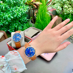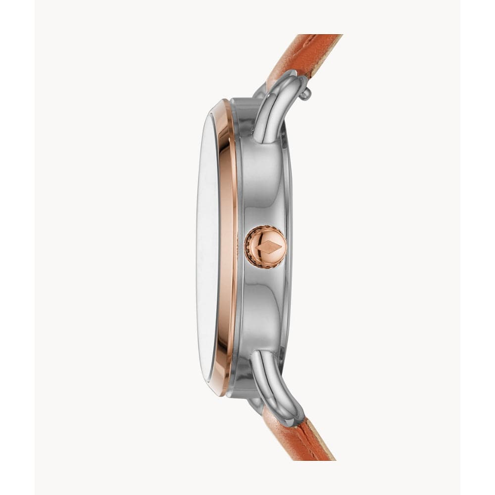 - Two-tone stainless steel case with blue sunray dial; genuine luggage brown leather band with buckle closure; interchangeable with all 16mm Fossil bands