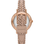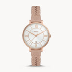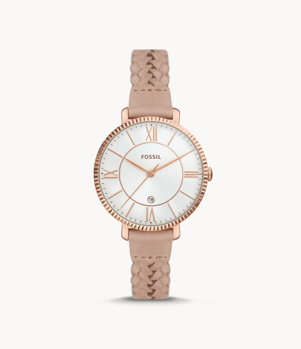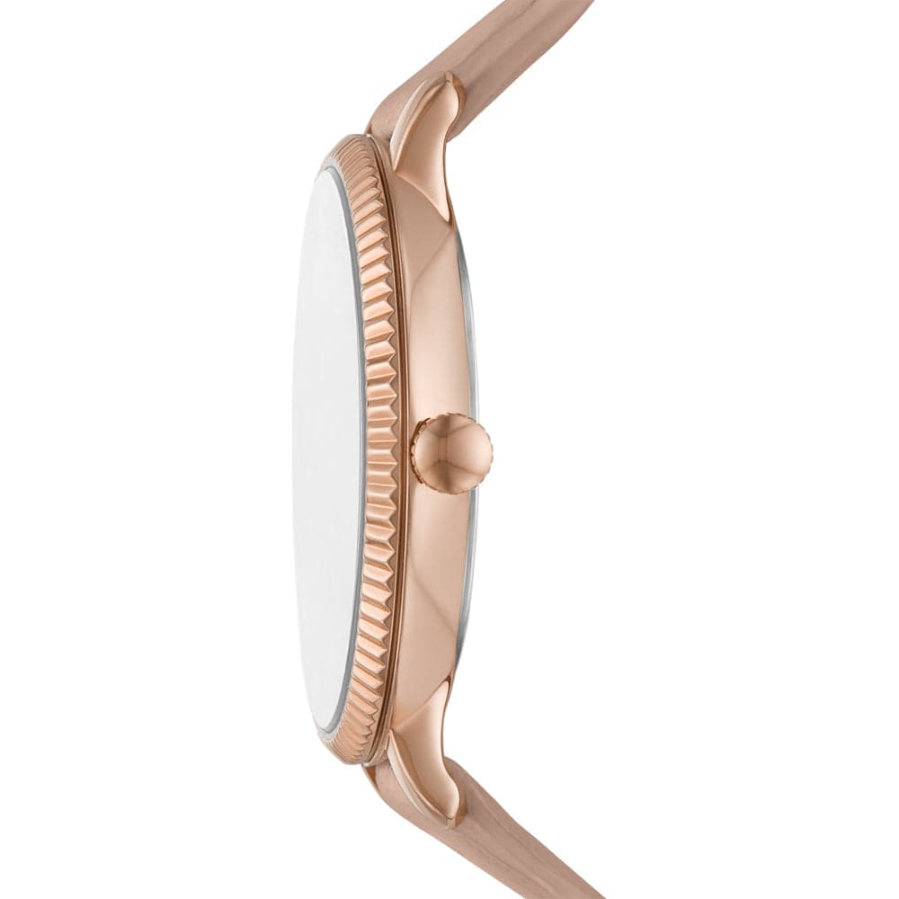 Fossil women's time only watch from the jacqueline collection. Watch with 36 mm case made of stainless steel with a polished rose gold finish. The case is round in shape with a thickness of 8 mm. The glass is transparent and the dial is silver in color. The distance between the lugs is 14 mm. Water resistance is 3 atm. The strap is in pro-planet leather with a shiny nude color finish. Strap with pin buckle. Movement: quartz / 3 spheres. The reference is ES5207