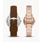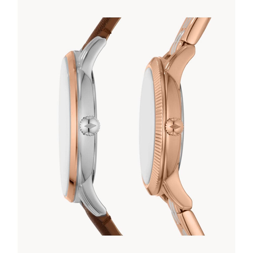 Fossil Addison Collection Set. Both Watches Features Stainless Steel Rose Gold Case, Silver Dial, and Roman & Stick Markers. Man's watch comes with a brown leather strap while the ladies' watch sports a two-tone bracelet.