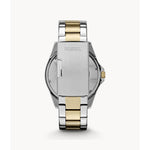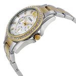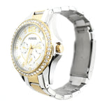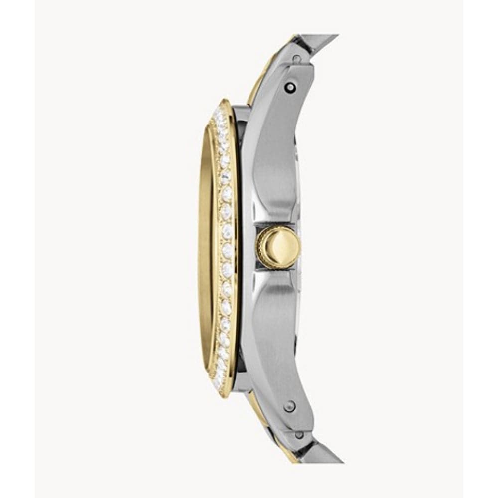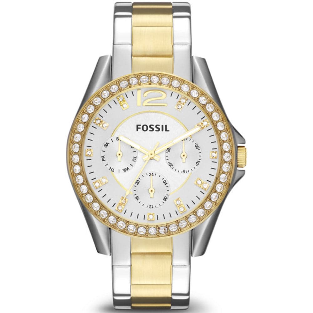 Stainless steel case with a two-tone (silver and gold-tone) stainless steel bracelet. Fixed gold-tone bezel set with 45 crystals. Silver dial with gold-tone hands and crystal hour markers. An Arabic numeral marks the 12 o'clock position. Minute markers around the outer rim. Dial Type: Analog. Luminescent hands. Three multi-function sub-dials displaying: 24 hour (GMT), date and day of the week. Quartz movement. Scratch resistant mineral crystal. Pull / push crown. Solid case back. Case diameter: 38 mm. Case thickness: 12 mm. Round case shape. Band width: 18 mm. Fold over clasp. Water resistant at 100 meters / 330 feet. Functions: date, day, GMT, second time zone, hour, minute, second. Dress watch style. Fossil Riley Multi-Function Two-Tone Stainless Steel Ladies Watch ES3204.