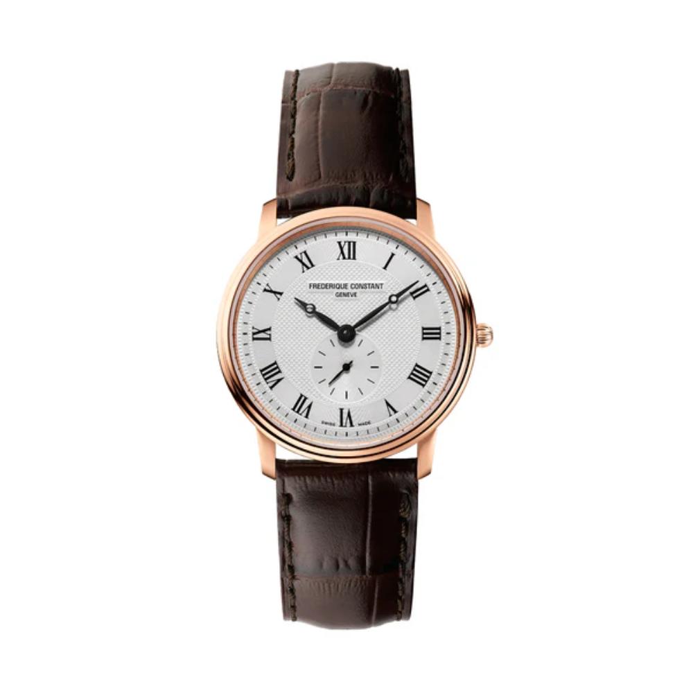 The perfect classic timepiece for him. This Slimline Classics Men's Quartz with rose gold plated stainless steel case has a small second hand with a white dial, clean modern stick indices on a brown leather strap.