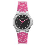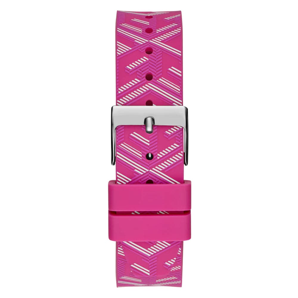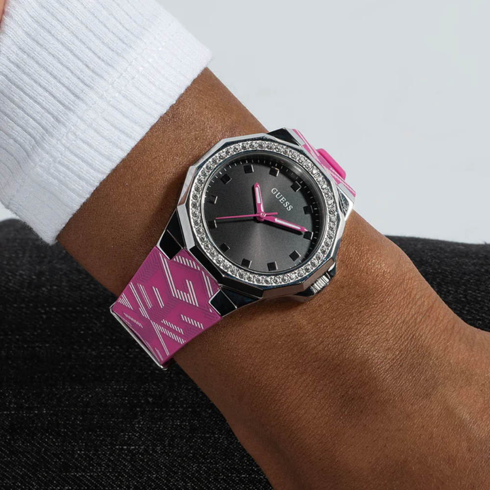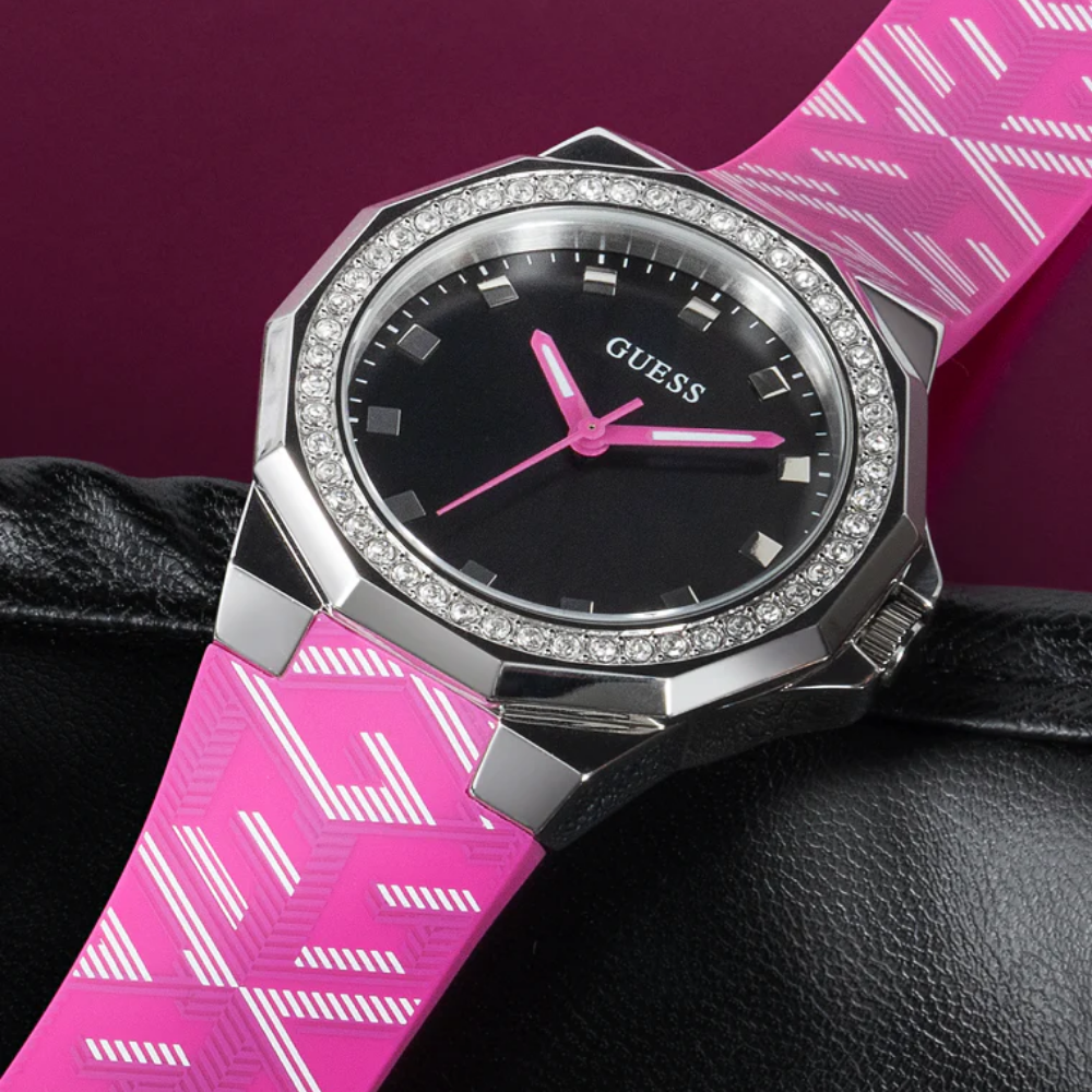 This stunning timepiece features a digitally printed G cube pattern on its silicone strap complimented by the stone details on it's unique bezel.