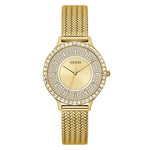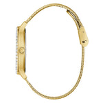 A beautiful watch surrounded by baguette crystals with a sunray glitz dial and herringbone pattern mesh strap.