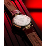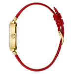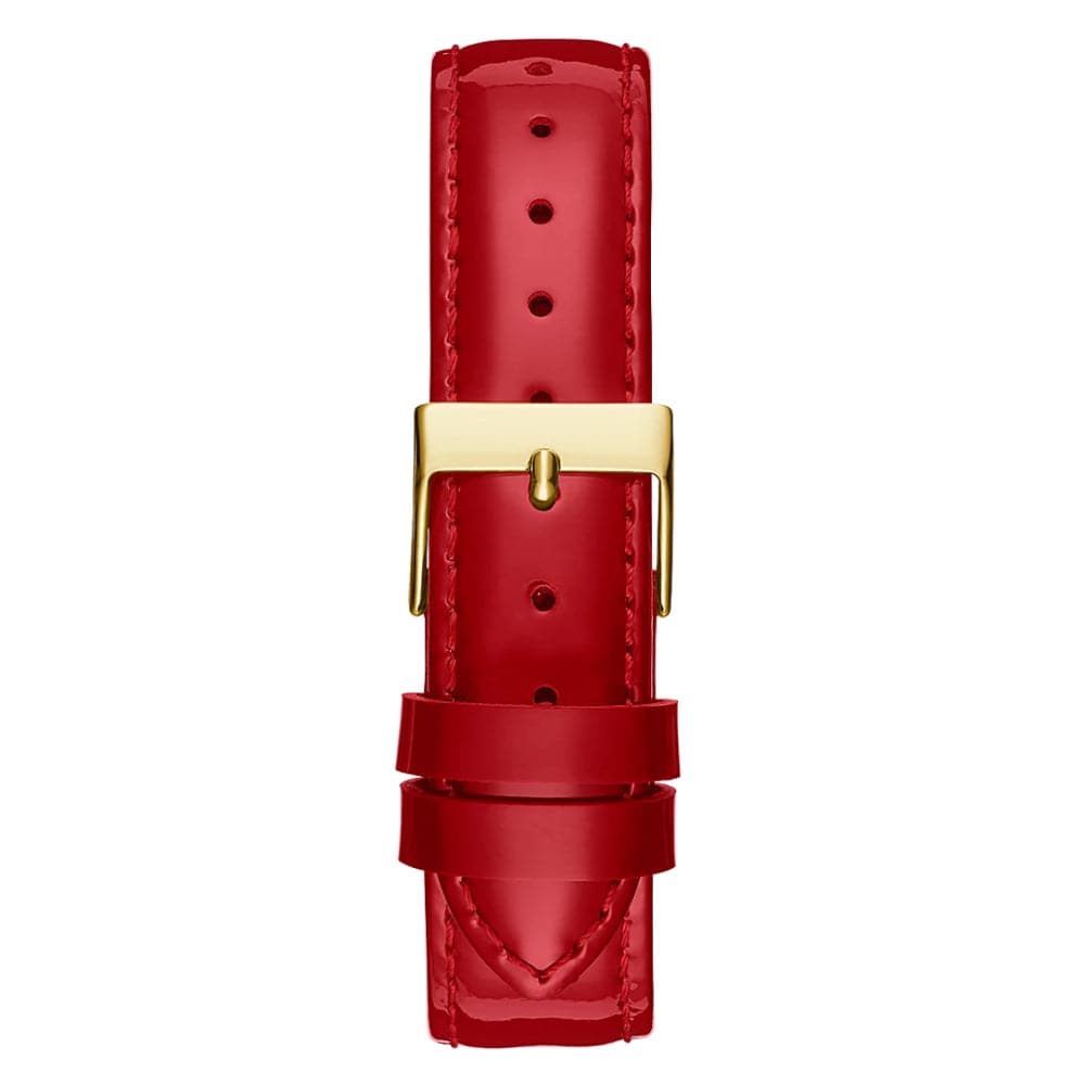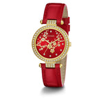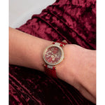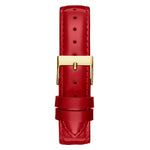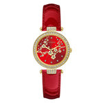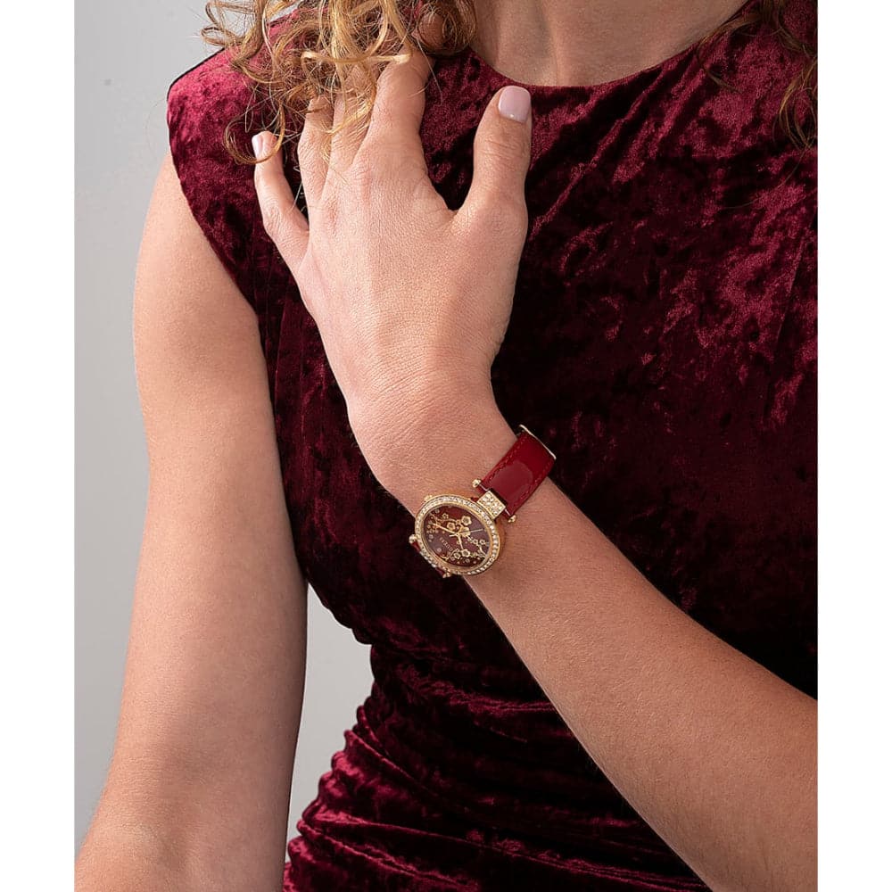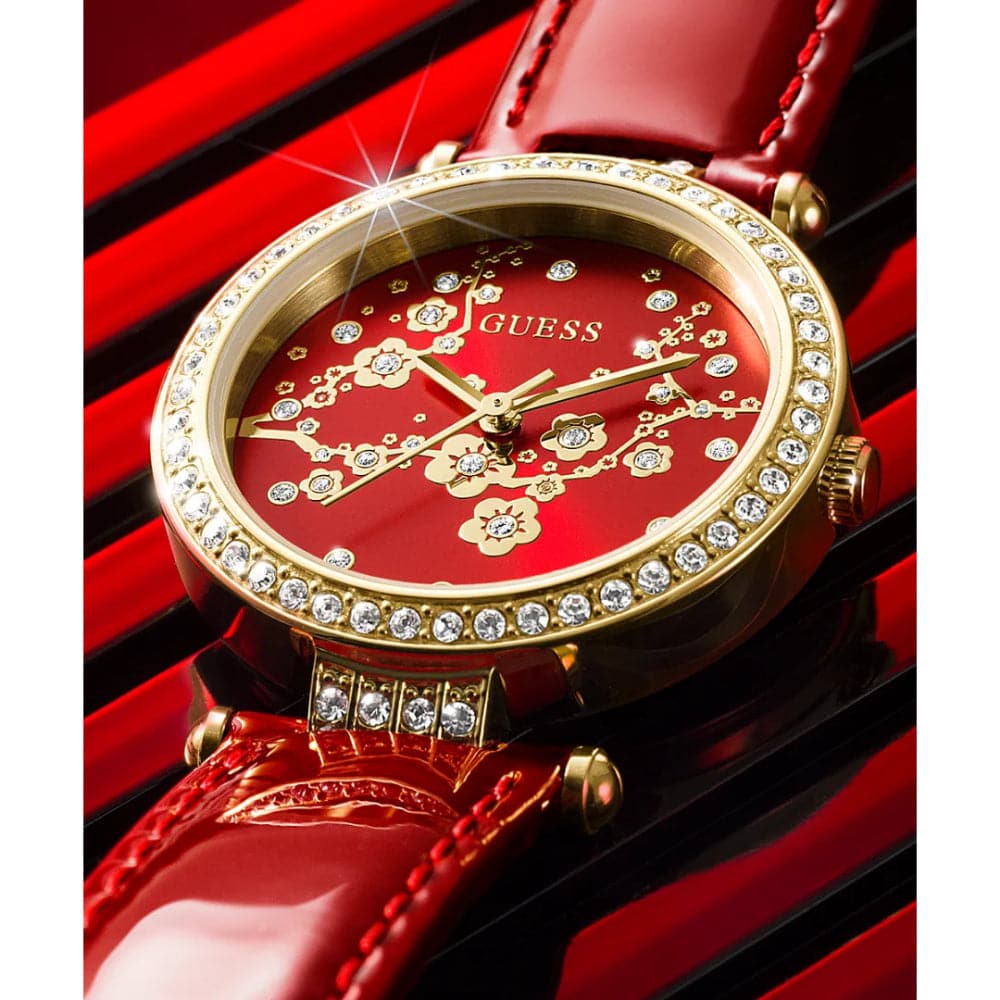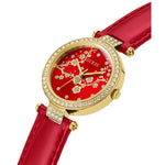 Adorned with sparkle, this case shimmers against its beautiful dial with a gold-tone cherry blossom pattern and a t bar connection for its genuine patent leather strap. This watch is the perfect way to celebrate the Lunar New Year with its unique design and iconic gold & red color combination.