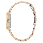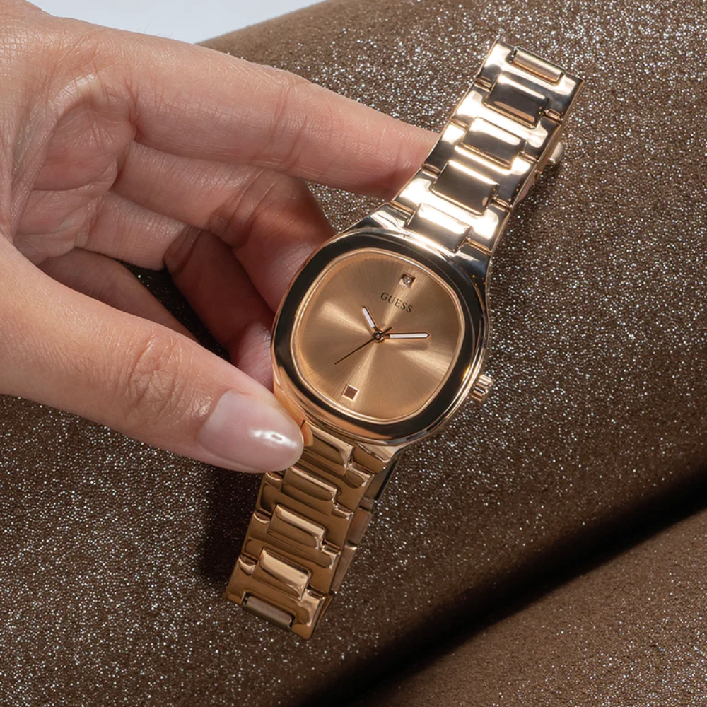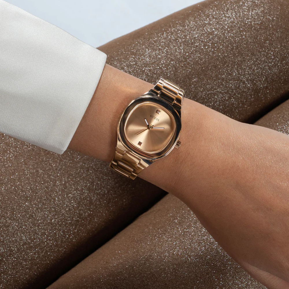 Bring the look of luxury with this elegant timepiece that features a NEW rounded square case with a genuine diamond marker at the 12 o'clock hour.