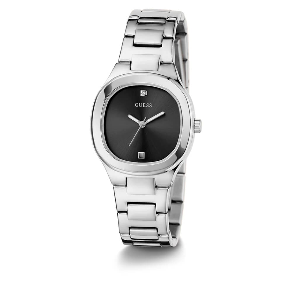 Bring the look of luxury with this elegant timepiece that features a NEW rounded square case with a genuine diamond marker at the 12 o'clock hour.