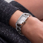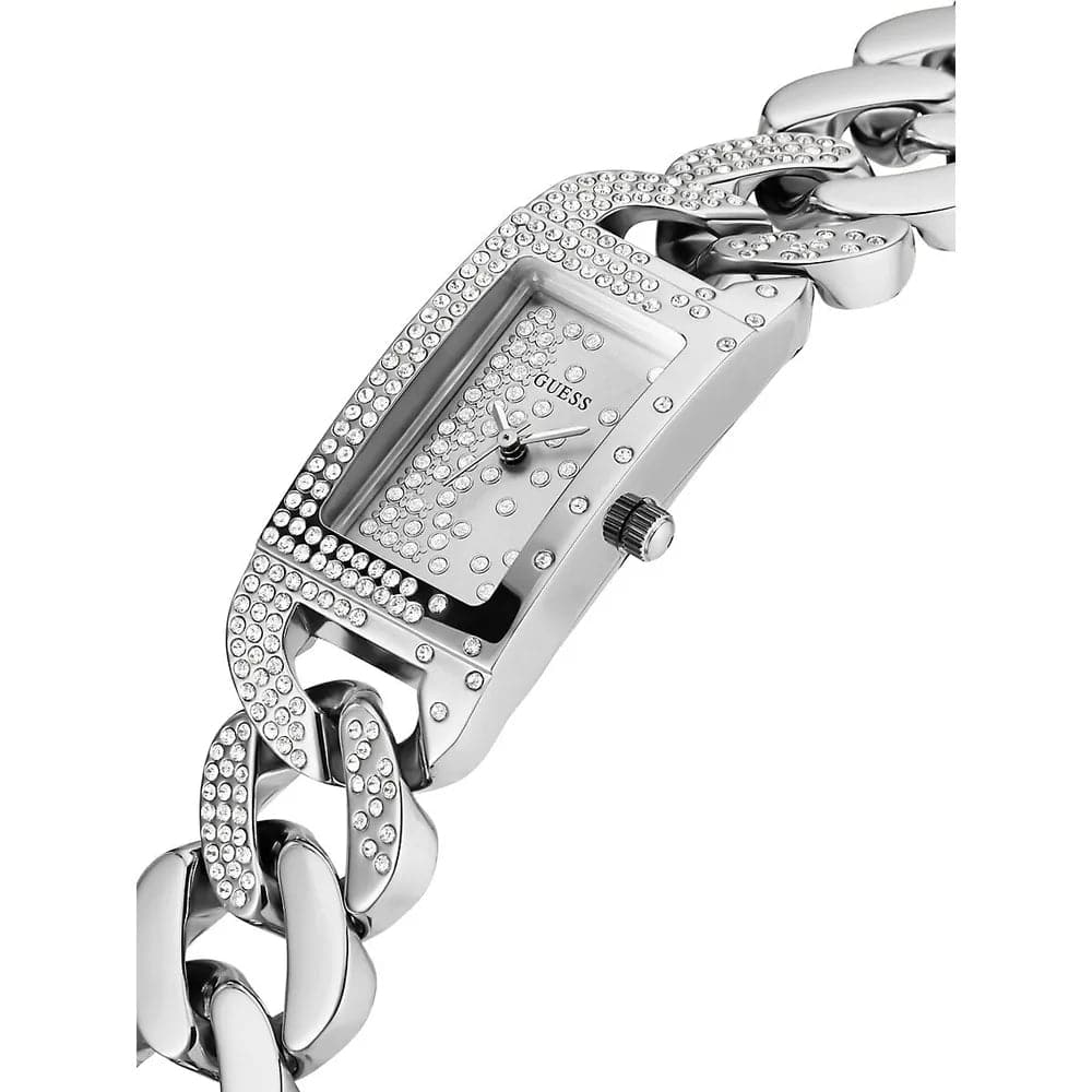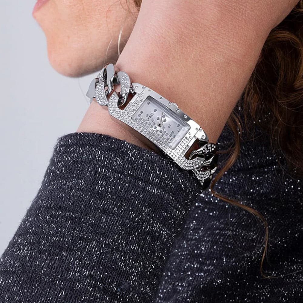 Guess Womens Silver Case with Crystals Silver Glitz Dial Silver Stainless Steel Multi-Chain Bracelet with Adjustment Link Watch.