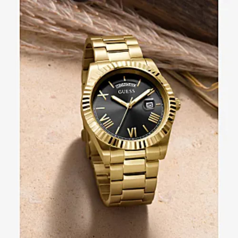 A classic look that never gets old. This coin edge bezel is integrated with a brushed and polished 3 link bracelet and featured a day of the week window at the 12 o'clock hour with a bubble date at the 3 o'clock.